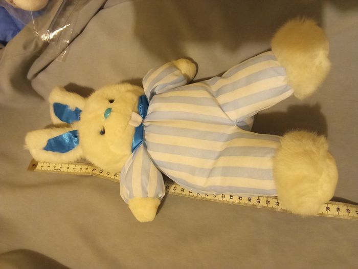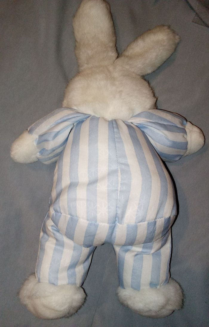 Grand lapin Pampers 36cm +/- blanc rayé rayures bleues claires bleu clair en posture debout plus d'étiquette prix fixe bicolore tissu fin toile de parachute - photo numéro 3
