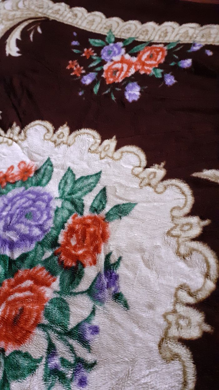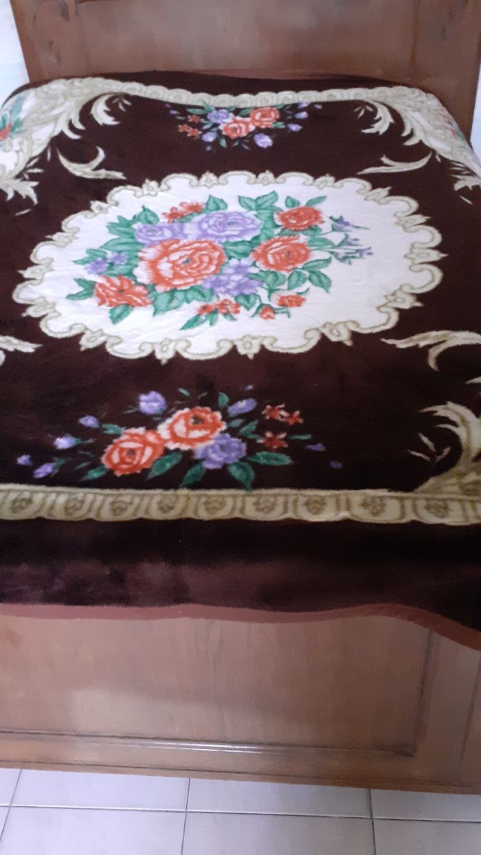 Vends une grande couverture, épaisse, aspect velours, couleur marron foncé avec fleurs multicolores, 200x240 mentionné sur l'étiquette mais en réalité mesure 230X392 cm. La composition n'est pas précisée sur l'étiquette.
