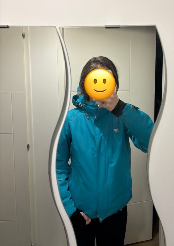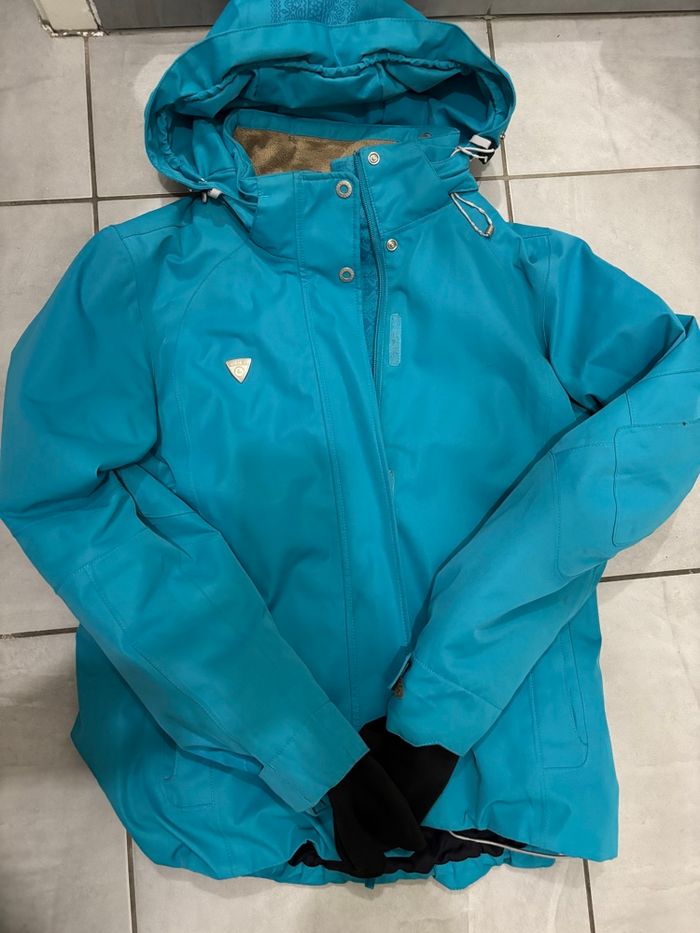 Joli veste de ski bleue en parfait état , taille 40 mais taille plutôt comme un 38 Poche intérieure , capuche , lien élastique pour cintrer afin de ne pas laisser passer le froid , imperméable, doublure pour les mains mitaines