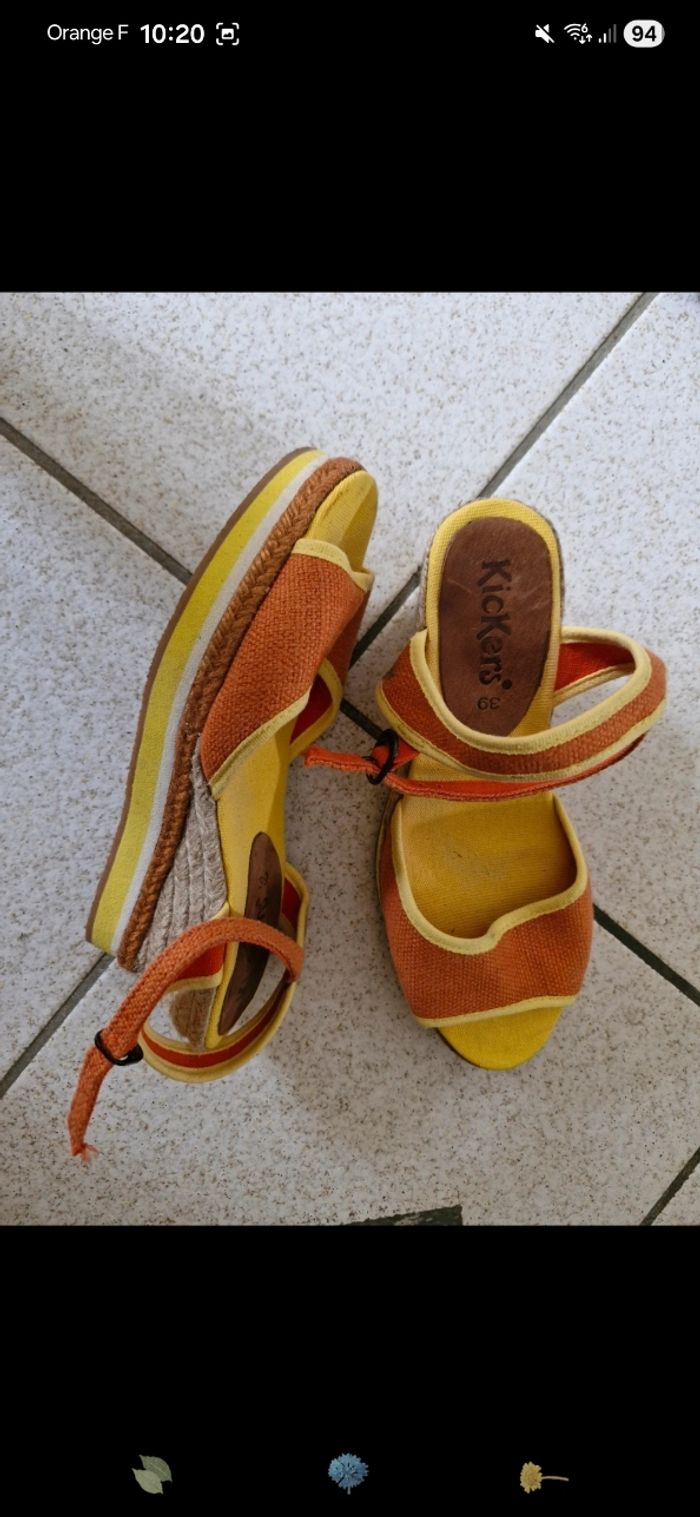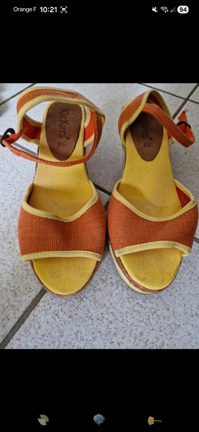 Chaussures été plate forme , kickers jaune et orange , talon 7,5 cm. Taille 39.
