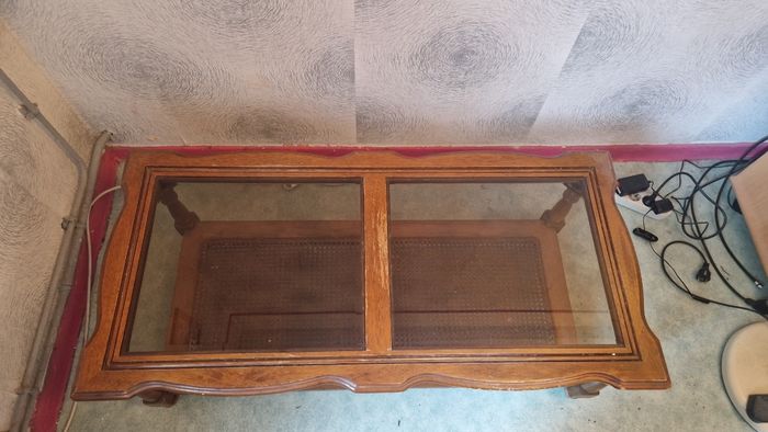 Vends table basse en bois et en verre Le bois est abîmé par l'usure du temps mais la table reste en bon état A venir recuperer sur boulogne billancourt