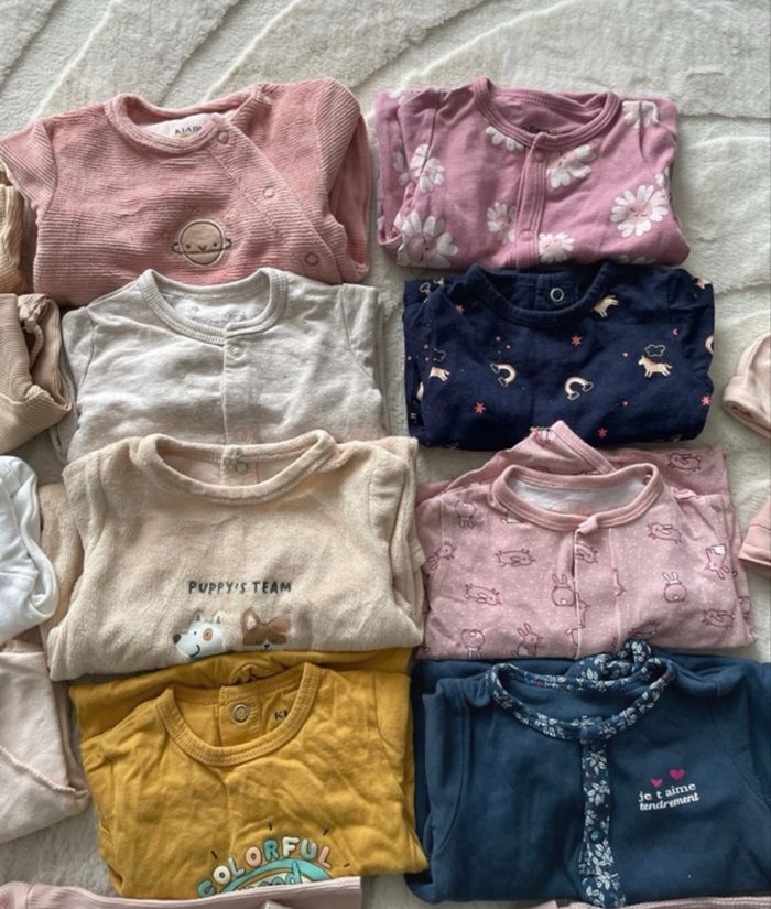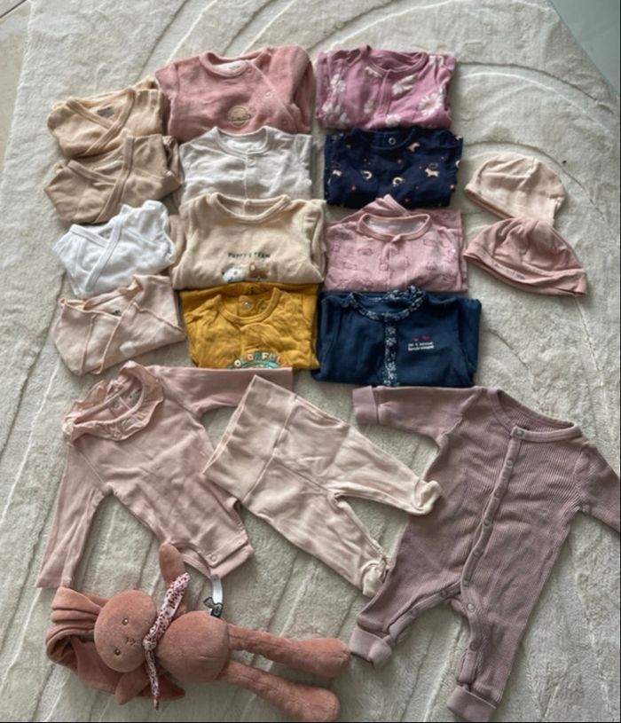 Lot en parfait état composé de 1 combinaison nid d’abeilles 1 legging avec pieds 1 body col Claudine 4 body cache cœur 8 pyjamas 2 bonnets #lisasbr_1mois #bébéfille #bebefille1mois #lotbebefille #lotbebefille1mois