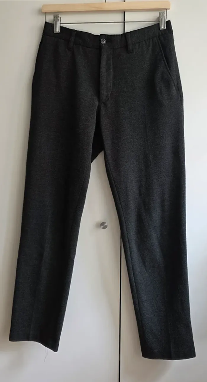 Pantalon de marque Zara, taille 38, 76% polyester, 24% viscose. Couleur anthracite chiné, 2 poches avant, 2 poches arrière. Passant pour ceinture. Mesure taille: 37cm Entrejambe: 67cm Longueur: 92cm