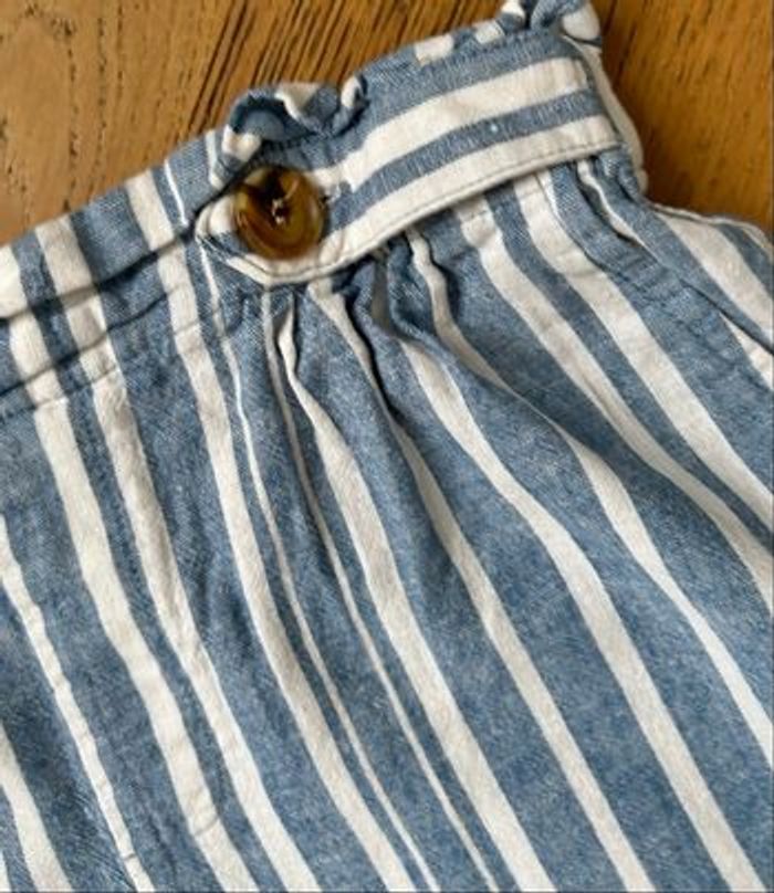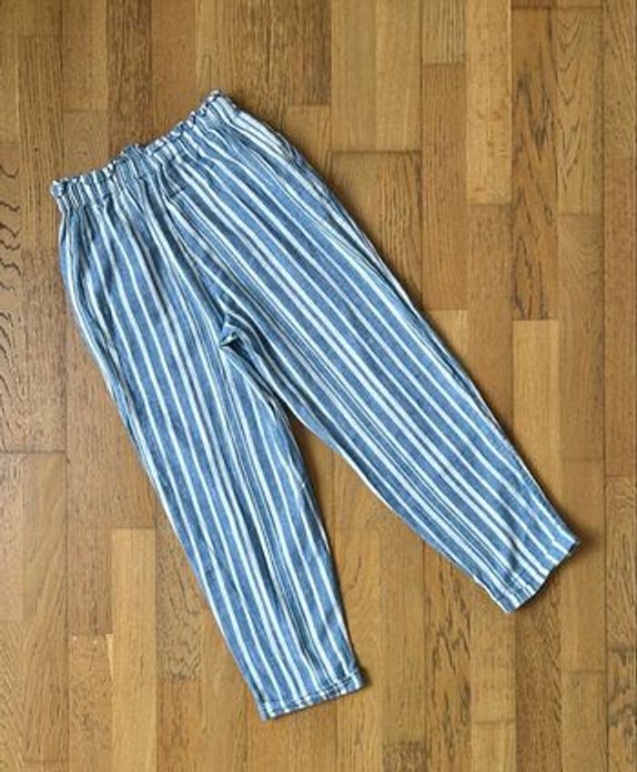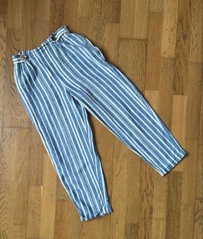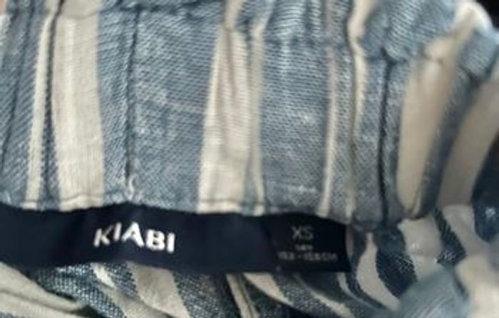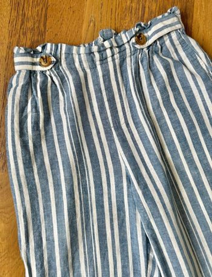 Pantalon fille taille 14 ans, marque Kiabi. Joli motif rayures bleu et blanc, style léger et confortable. Taille élastiquée, idéal pour le quotidien, l’école ou les beaux jours 55% lin 45% coton