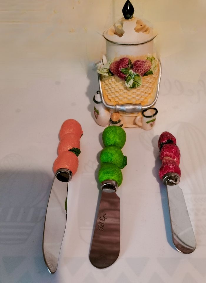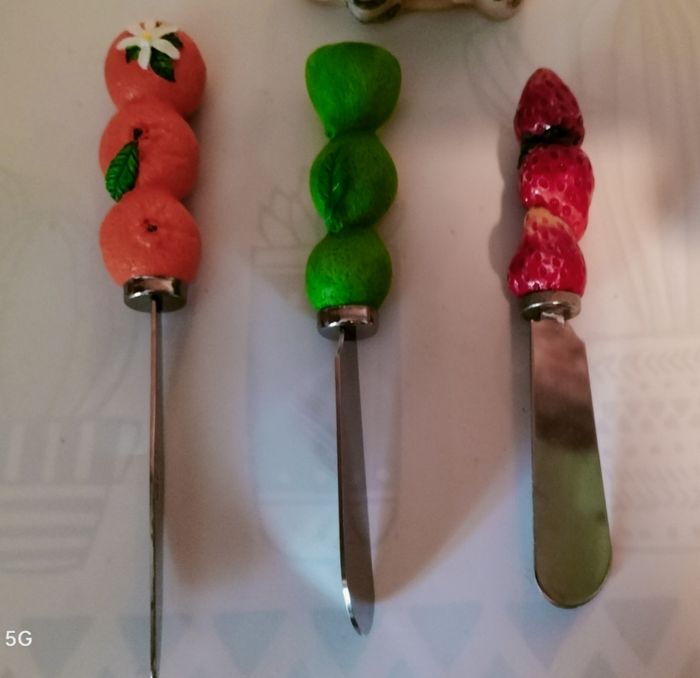 Lot de couteaux à beurre en acier inoxydable avec support - Type de produit : Couteaux à beurre. - Forme : fraise , pomme et orange - Matière : Acier inoxydable - Couleur : Multicolore Très bon état 8€