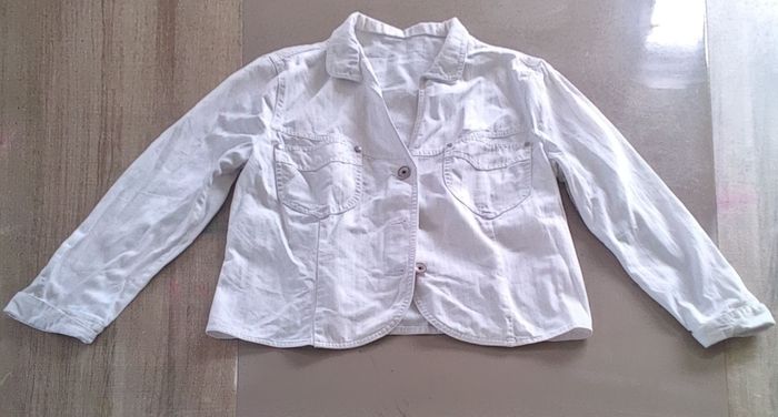 Veste à manches longues, de taille L et de couleur blanc. Veste en 100 % coton, confortable, respirante et agréable à porter. Veste en bon état pour femme. Expédition dès le lendemain. Tour de poitrine 94 cm Tour de taille 88 cm Largeur épaule 37 cm Longueur manche 59 cm Longueur totale 59 cm Prix 6€
