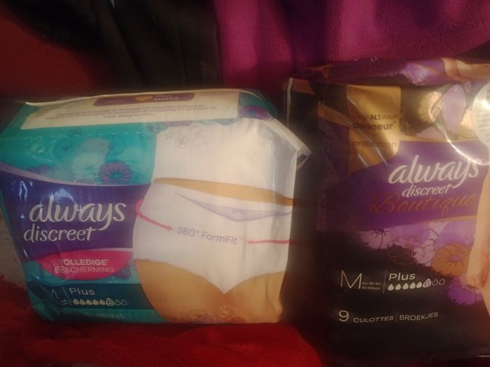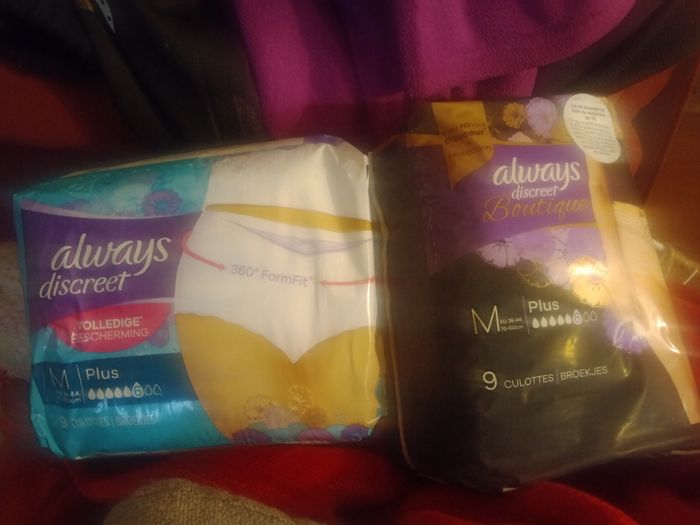 2 paquets de culottes always discreet pour fuite urinaire. 1 paquet culottes blanches et 1 noire. Neuf jamais ouvert