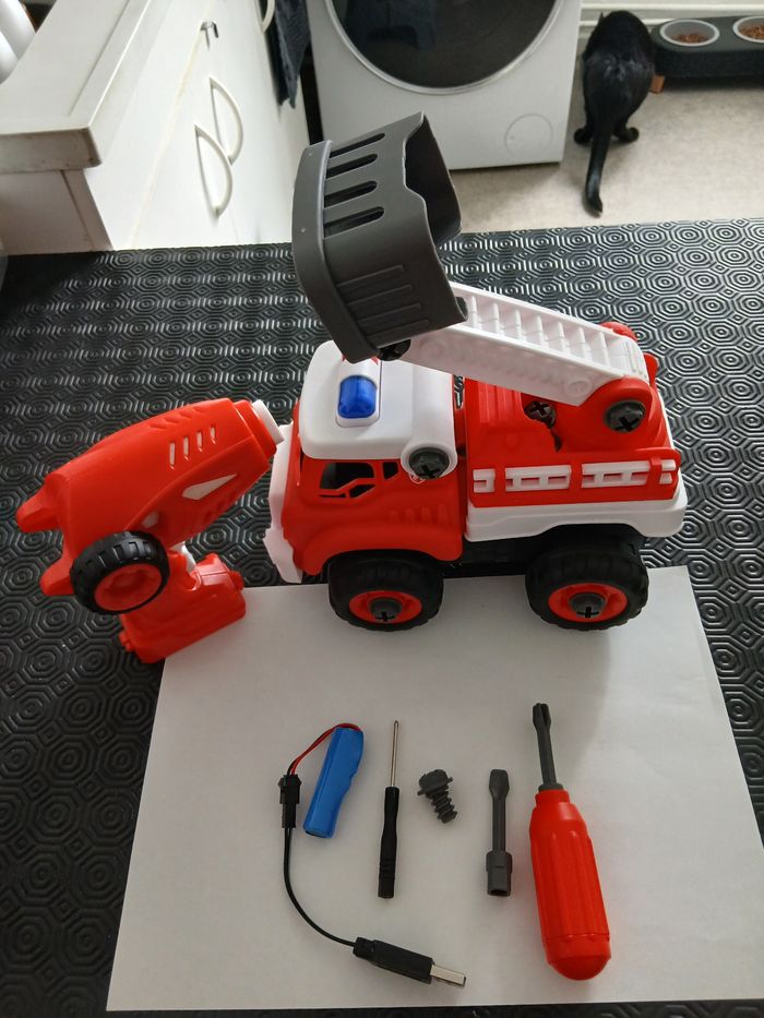 Petit Camion Pompier Constructable et Radiocommandable. Le Camion est Alimenter avec une Pile Rechargeable et la Télécomande en Forme de Visseuse est Alimenter avec 2 Piles AA (Non Incluse). Les Sons du Camion et de la Viseuse fonctionne Parfaitement, La Lumiere de la Viseuse Fonctionne Aussi. Ne Manque Aucune Pièce.