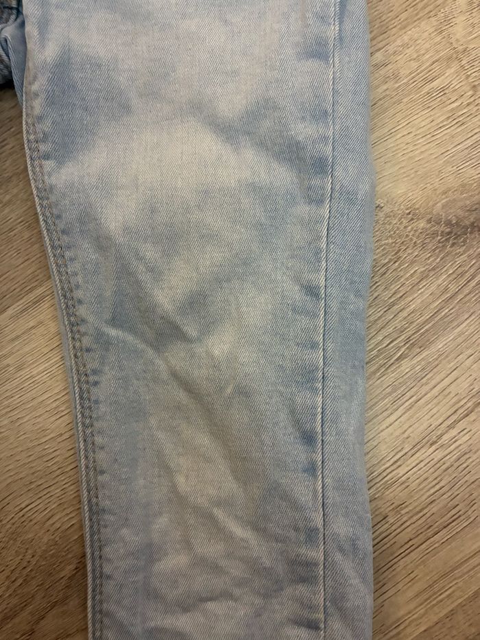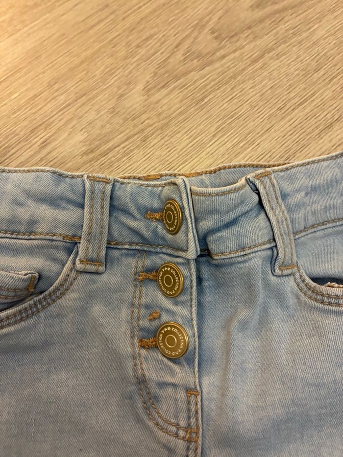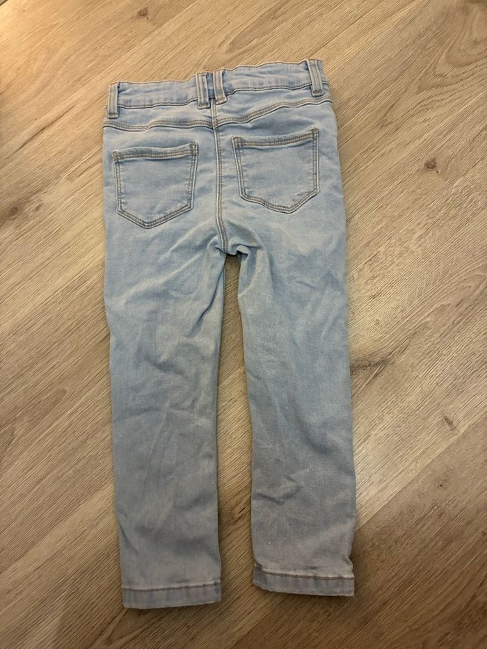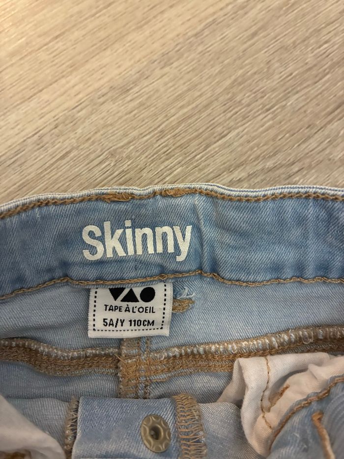 Pantalon jean skinny, taille ajustable. Légèrement blanchi au niveau des genoux. Taille : 5 ans, 110 cm. Marque : Tape à l’œil.