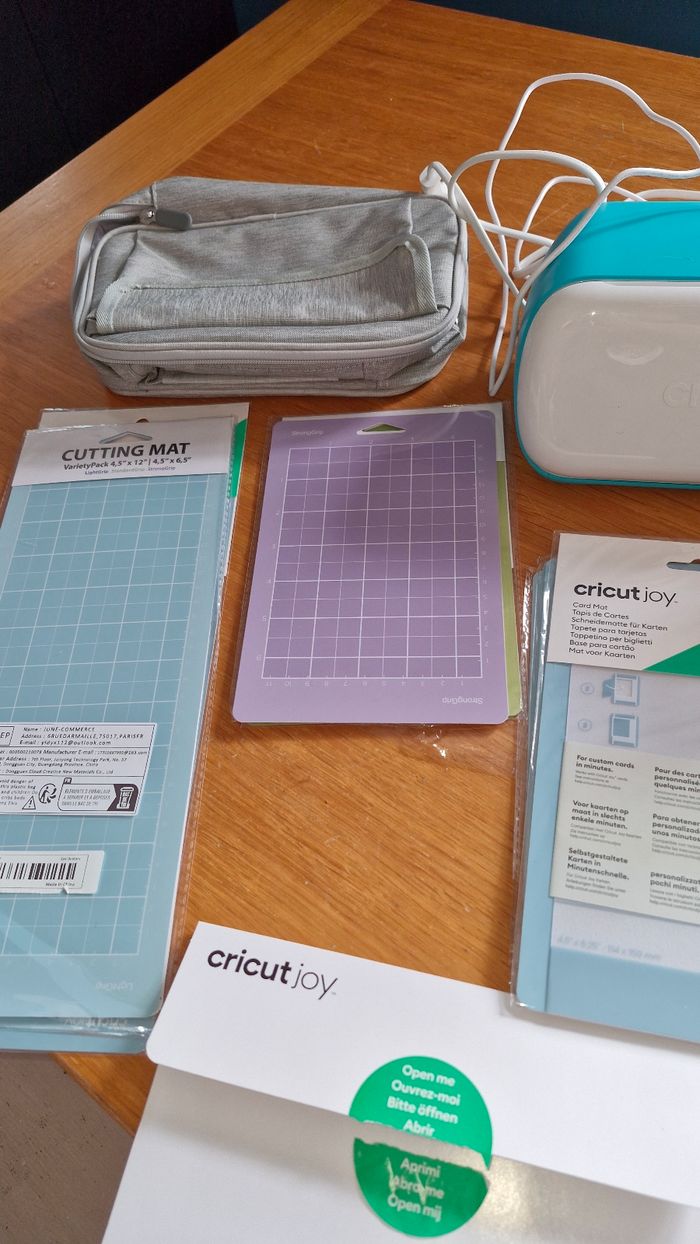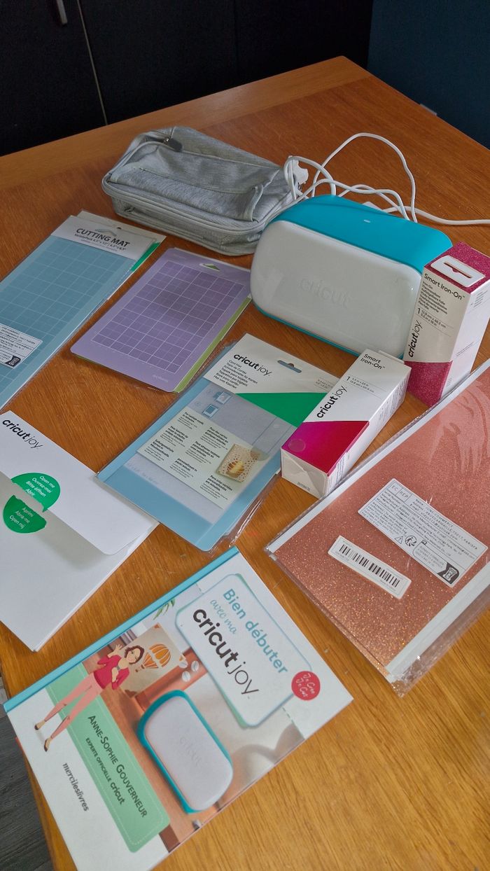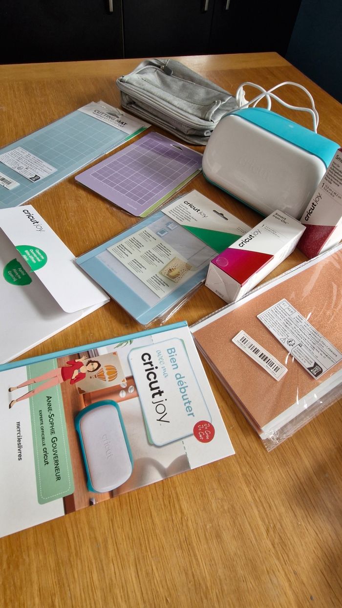Le lot contient : La cricut joy avec le mode d'emploi Des vinyles et thermocolants Un livre pour débuter 5 tapis pour fabriquer des cartes 6 tapis tailles différentes et couleurs Un sac de rangement Et Je vous offre des cartes à fabriquer