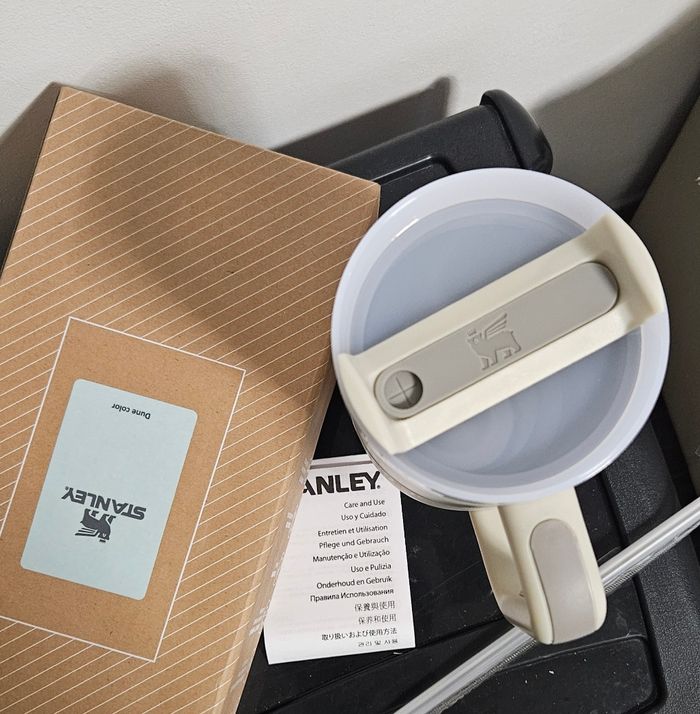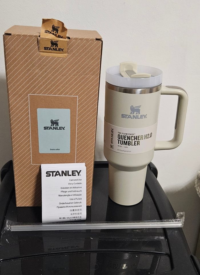 Mug isotherme Stanley Quencher / Tumbler, capacité 1,18 L, couleur vert Dune ( gris + beige) Jamais utilisé, simplement stocké. Poignée intégrée, design robuste, usage quotidien facile. Convient pour boissons chaudes et froides. Vendu avec la boîte visible sur les photos. Envoi soigné.
