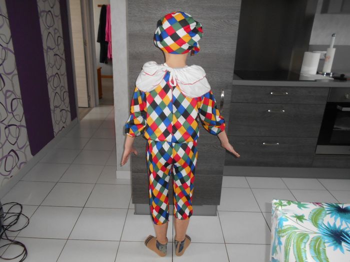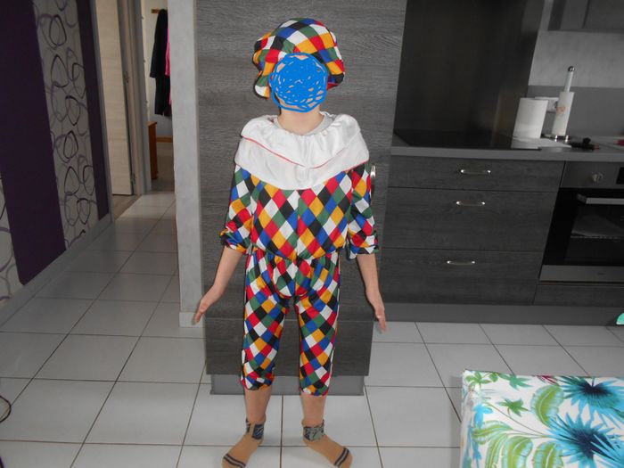 Vends ce déguisement Arlequin, taille: 5/7 ans, élastiqué aux bouts des bras, des jambes et au niveau de la taille, en bon état. Sur ma photo, mon modéle est trop grand pour le déguisement, les bras et les jambes arrivent bien aux poignets et aux chevilles (mon fils à 9 ans mais comme il est assez fin, il sait encore le mettre).