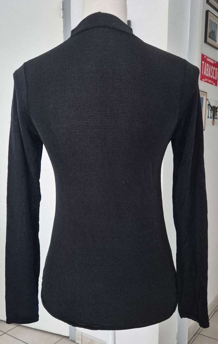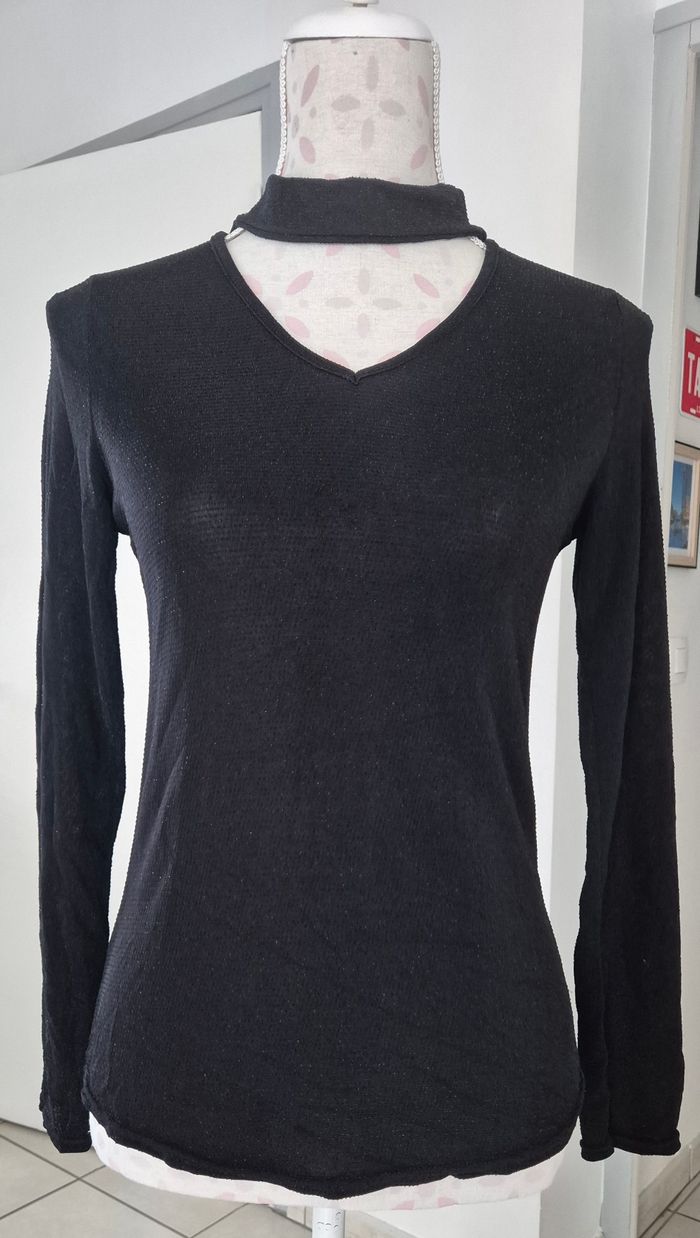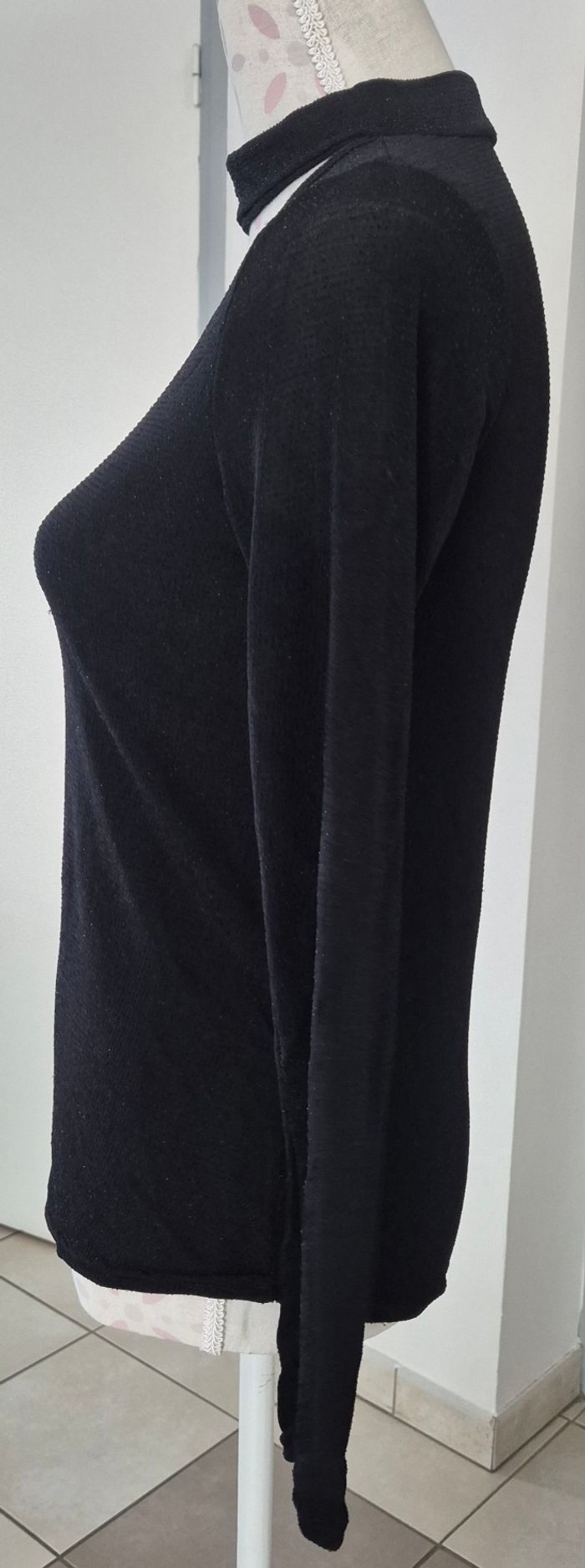 Haut fluide noir légèrement pailleté Col V avec tour de cou Manches longues
