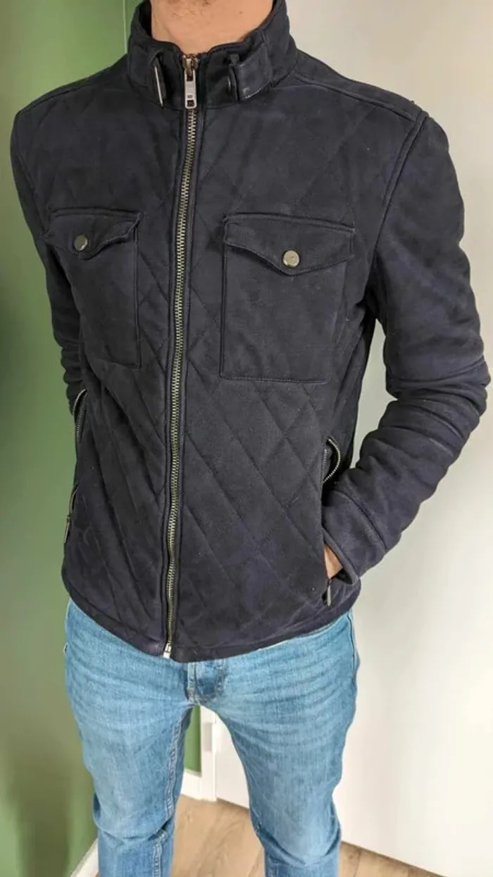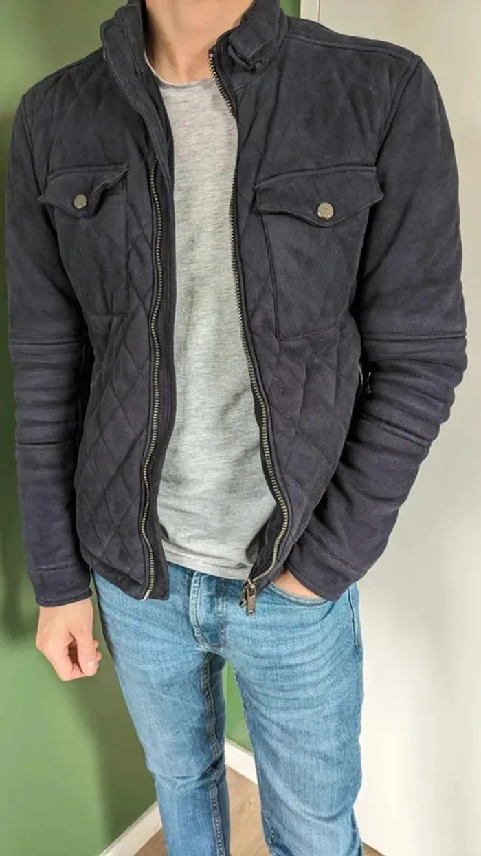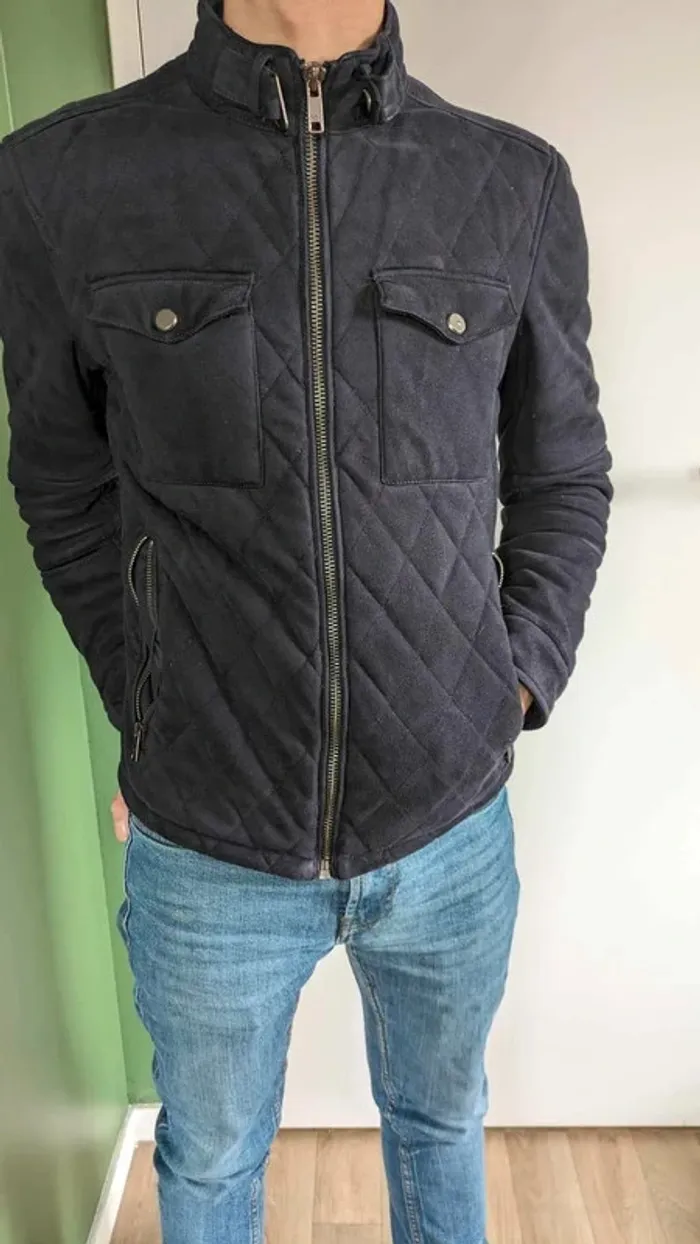 Veste mi-saison Zara taille S bleu marine. Petits défauts de fabrication sur les boutons des poches avant.