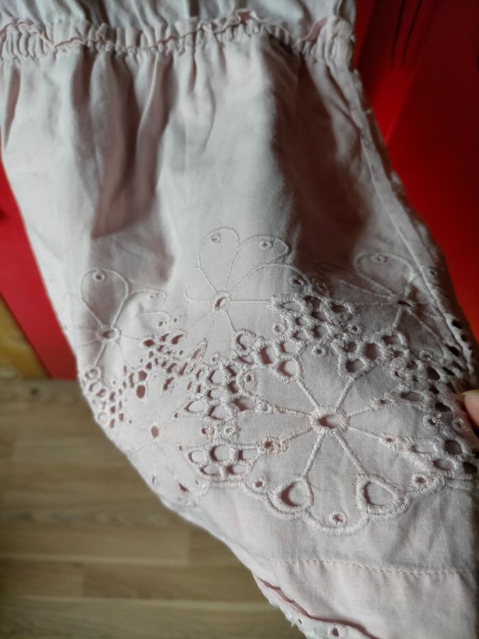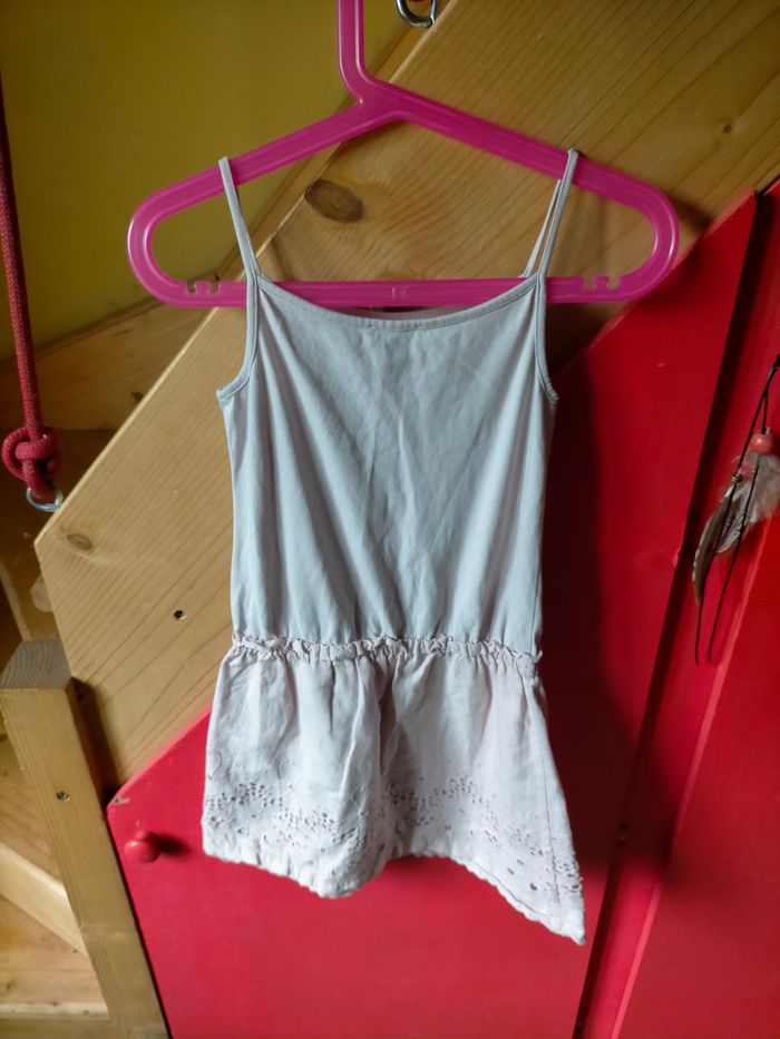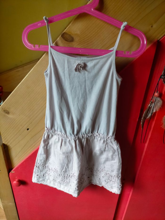 TBE Très jolie robe bain de soleil bi-matière : Haut en jersey de coton rose pâle à fines bretelles et petit nœud à l'encolure. Taille élastique et base en cotonnade avec broderies