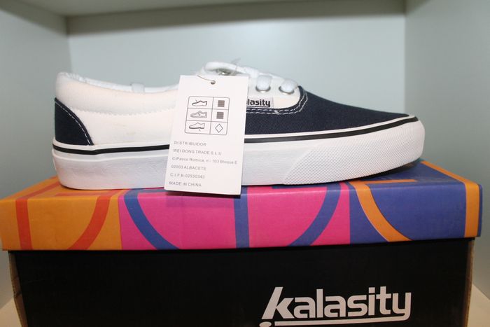 baskets basse blanche et bleue pointure 39 neuves dans boite genre vans,model ado ou homme.Marque kalasity. réf 1259 n'hésitez pas à faire un lot.