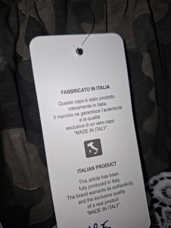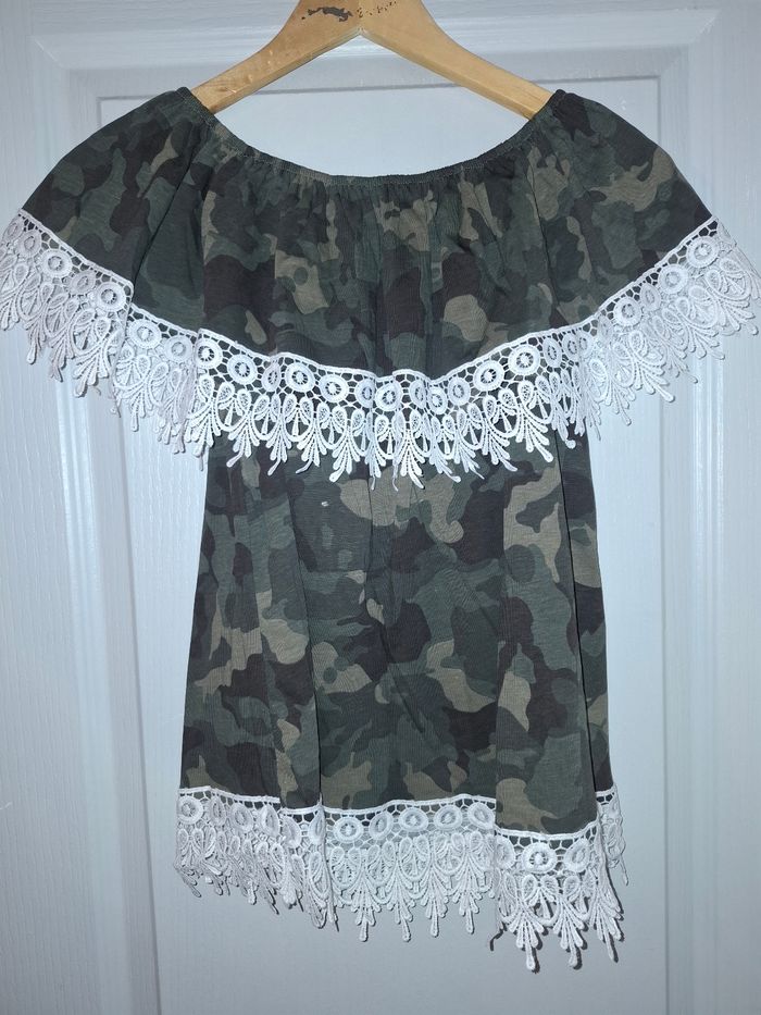 Top col bardot motif camouflage, avec détails imitation broderie anglaise. Jamais porté, étiquette toujours en place.