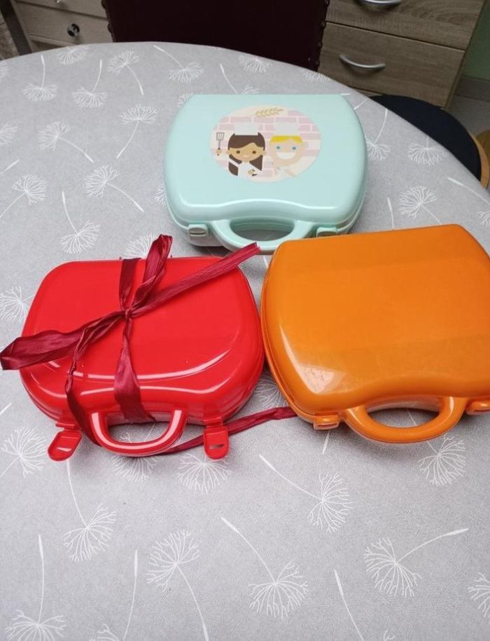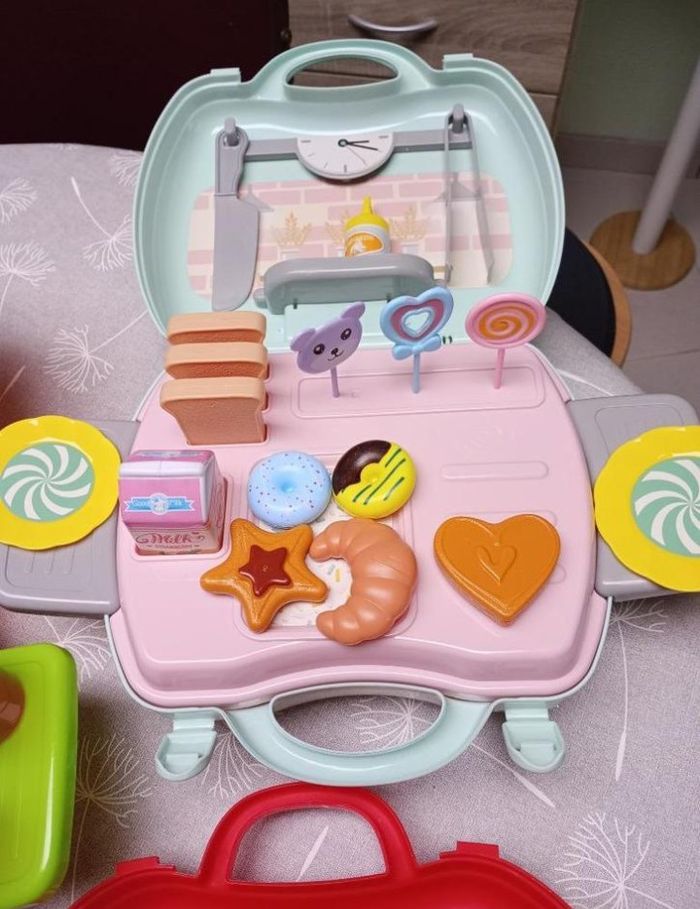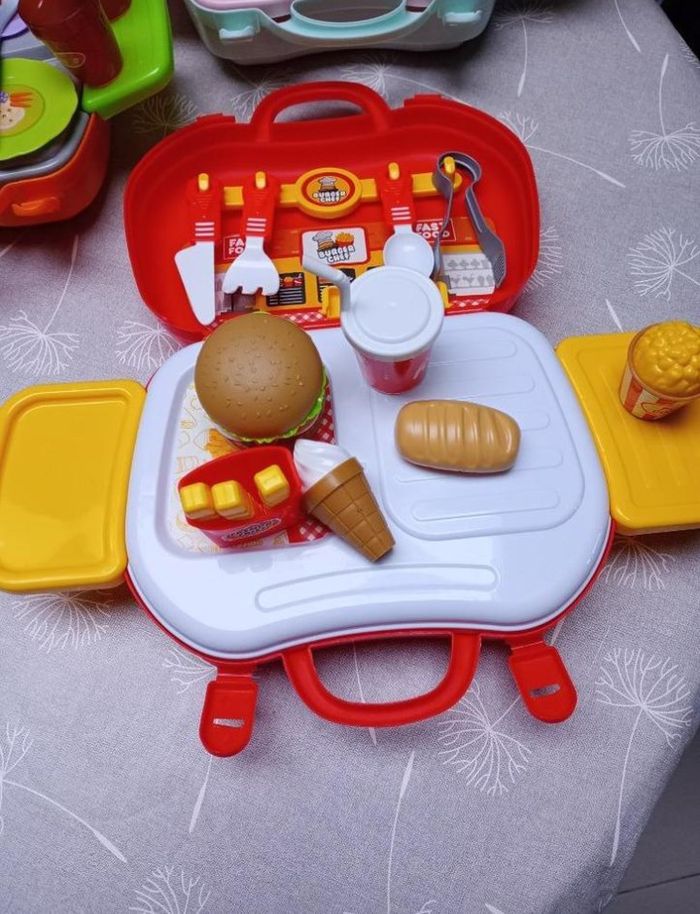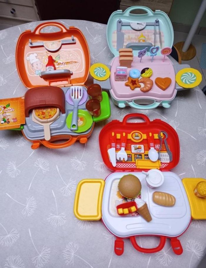 3 valisettes pour emporter et jouer n'importe où : La Pizzeria La Boulangerie-Pâtisserie Le Fast Food Tout est en excellent état mais la valisette du Fast Food ne se ferme plus. Il y a un ruban pour la fermer.