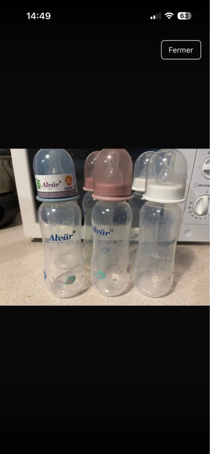 Lots de 6 biberons alvar (250ml )0 mois + Ils ont tous leurs tétines Neuf jamais servi juste stérilisé car ma fille n'aimer pas cette forme de tétines. (Seule trace apparente l'étiquette des capuchon c'est mal enlevé lors de la stérilisation)