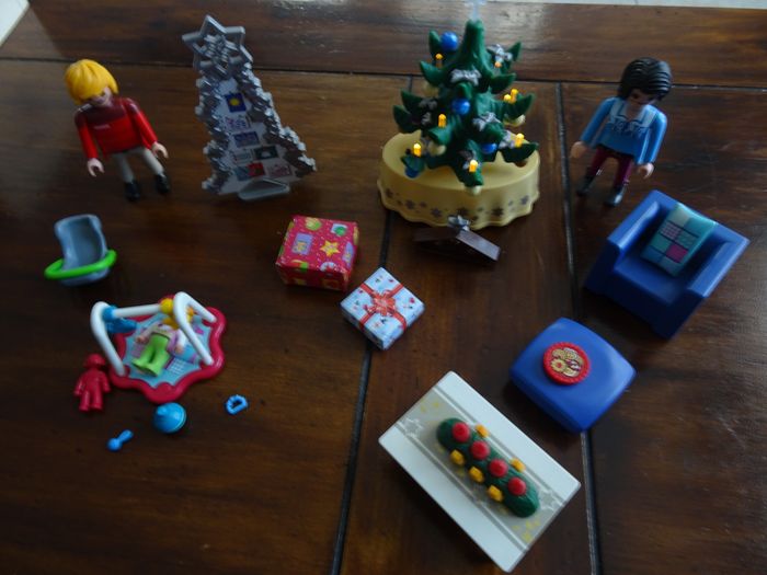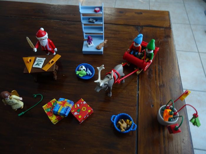 Lot de Playmobil Christmas comprenant: *9495 Famille et Salon de Noël La famille Playmobil est réunie au salon pour fêter le réveillon de Noël ensemble. Contenu : 3 personnages, 1 sapin de Noël à effets lumineux (avec 2 piles LR03 non fournies), du mobilier (fauteuil, table, ...) et des accessoires (cadeaux, jouets, crèche...). Lot complet en très bon état sauf la tige de l’étoile qui est abimée, mais non visible une fois insérée dans le haut du sapin. *5494 Atelier de Père Noël Avec 4 personnages dont un Père Noël et un Angelot, de nombreux cadeaux (peluches, paquets cadeaux, jouets, poupée...) et un traineau. Ce lot est en très bon état, sauf les petits cadeaux en carton qui sont appuyés. Je vends exactement ce qui est sur la photo, le contenu d’origine n’est pas complet.