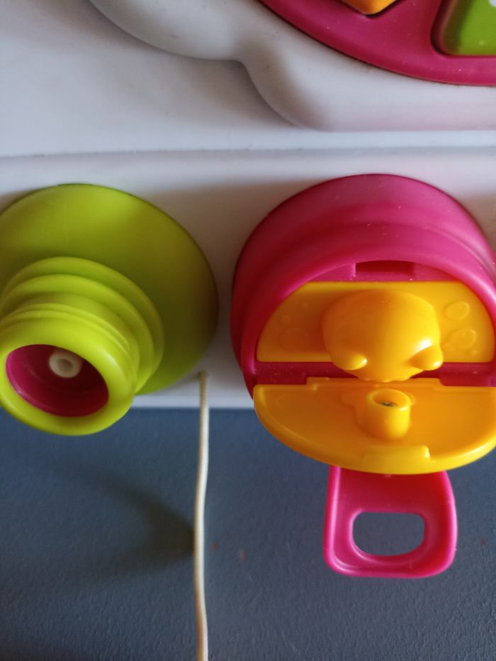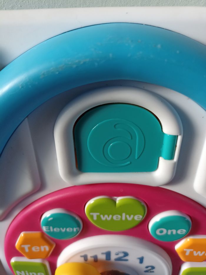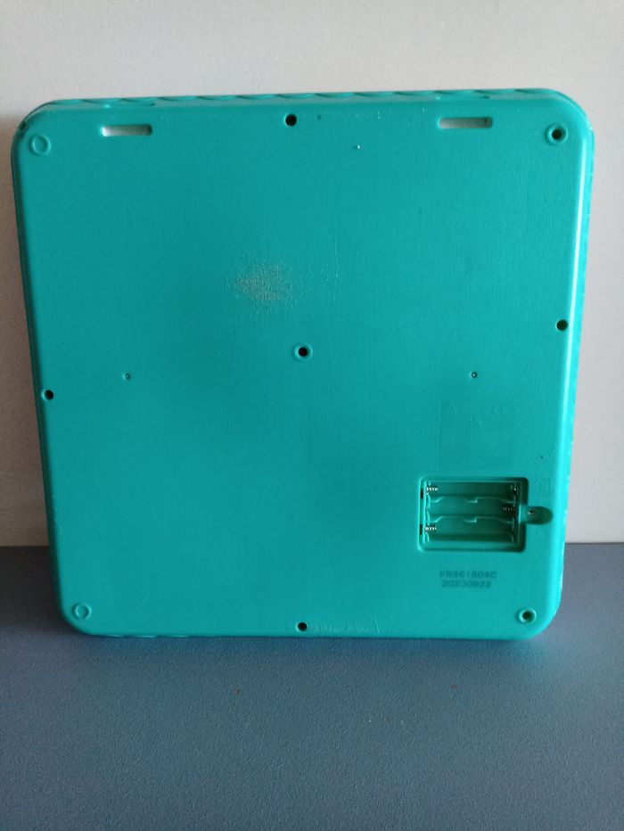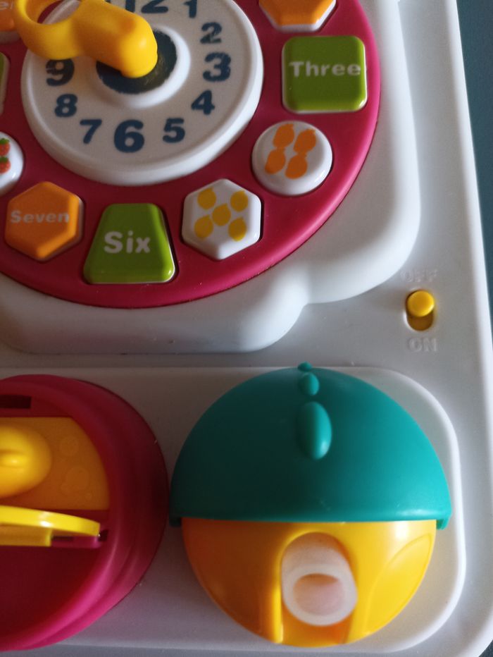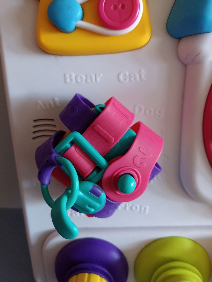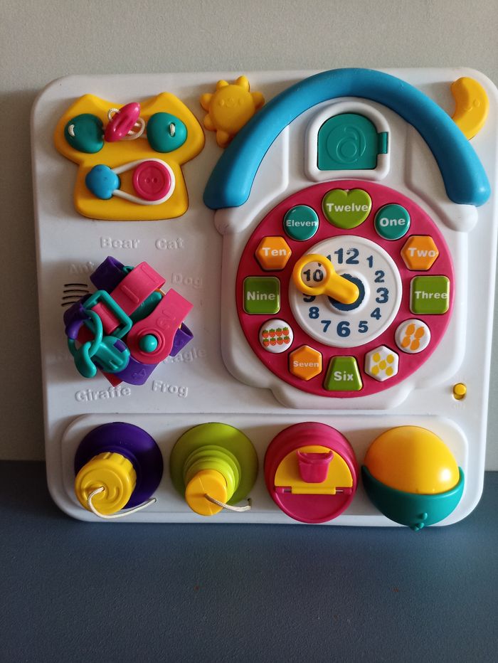 Tableau d'éveil élémento tablo. Auby. Autours des fermetures de vêtements, gourde, l'heure. Différentes formes, couleurs. Tourner, appuyer, son. 18 mois. Fonctionne à piles non fournies.