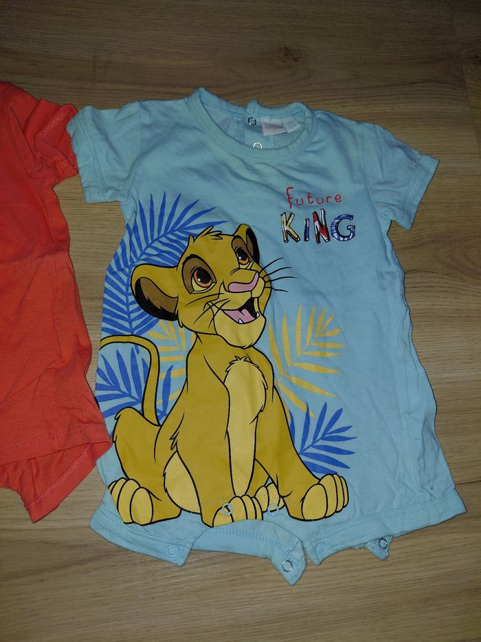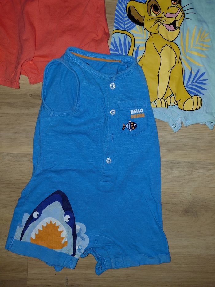 Ideal pour lété Taille 6 mois Le lot se compose de 3 barboteuses 💥une turquoise marque z motif shark 💥une bleu clair le roi lion marque disney 💥la derniere est de la marque kiabi Elles sont en tres.bon etat.