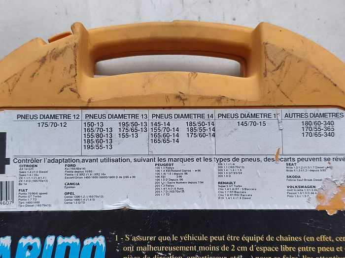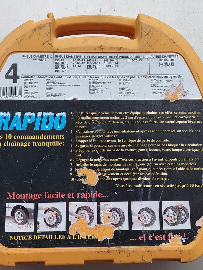 Je vends ces chaînes neige Rapido. - Type de produit : Chaînes neige - Marque : Rapido - Caractéristiques : Montage facile et rapide, Sécurité jusqu'à 50 km/h - État : Comme neuves N'hésitez pas à me contacter pour plus d'informations.