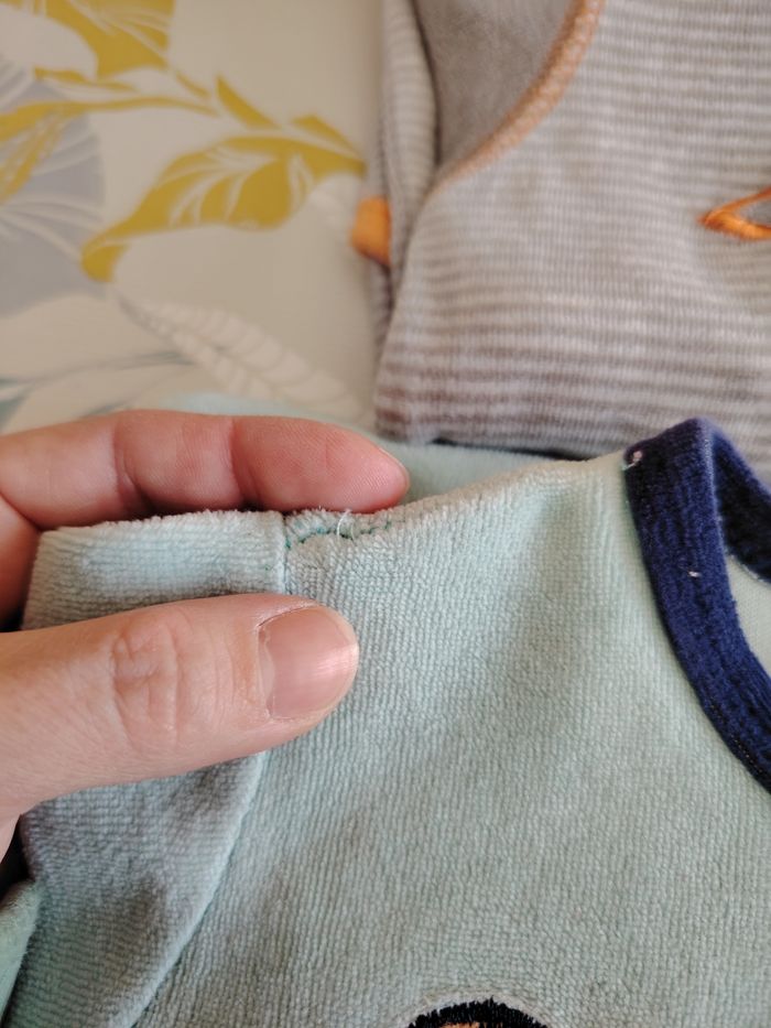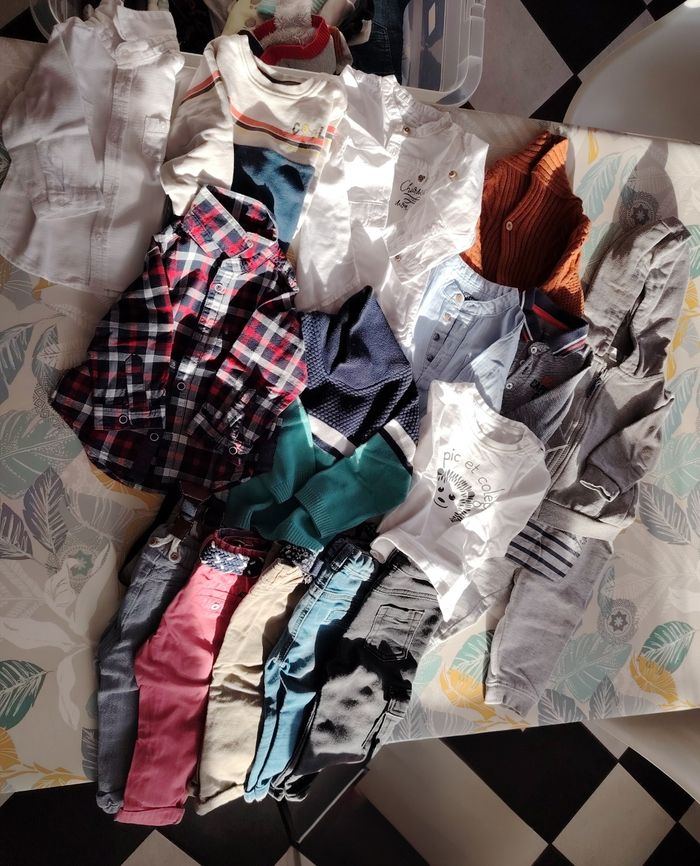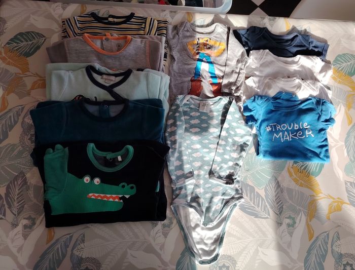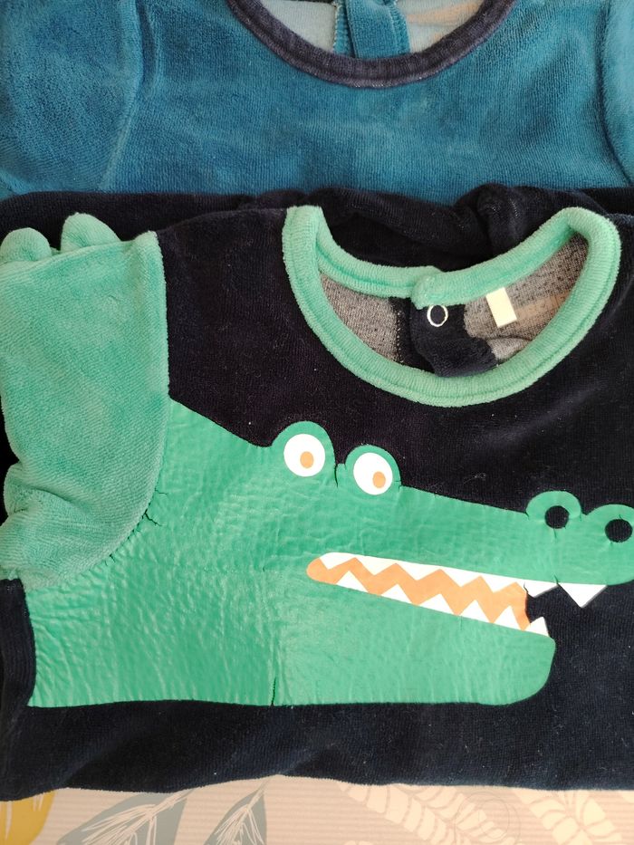 Lot complet composé de : 5 pyjamas dont un avec des léger trou et un autre ou le crocodile est craquelé , 4 body manche courte avec des légères tâches et une petite échelle à la pression et le flocage craquelé. 6 pantalons, 4 chemises, 2 gilets, 4 pulls