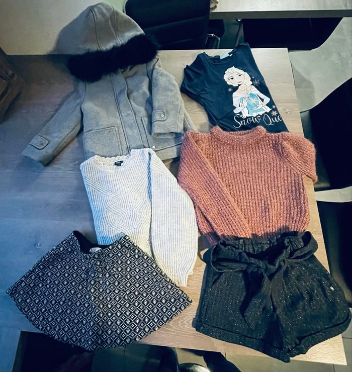 Lot fille 4 ans hiver plusieurs marques 1 haut de pyjama 2 pulls 1 jupe 1 short 1 manteau
