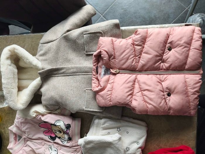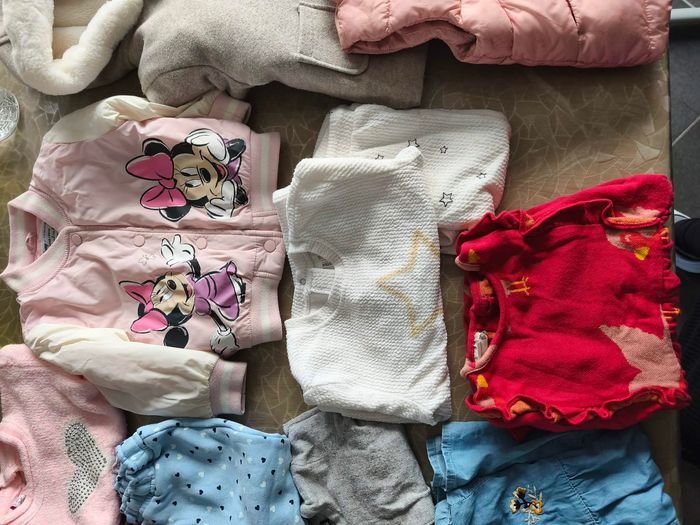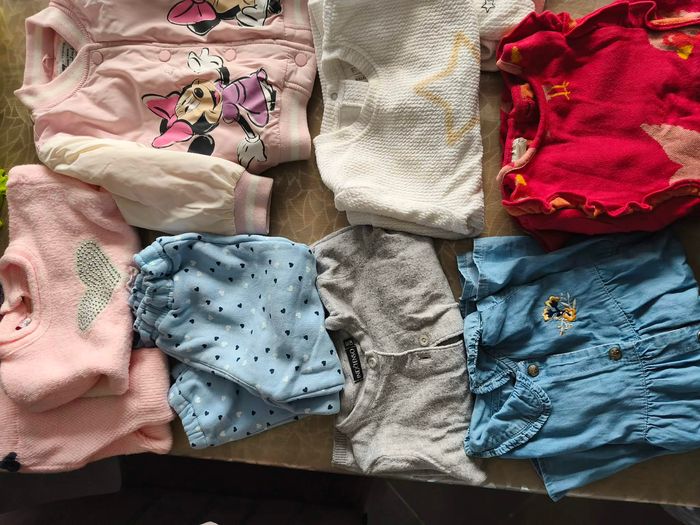 Ce lot comprend : - en très bon état : Une doudoune sans manche Une veste Disney Minnie Un pantalon type jogging 2 robes Un gilet 1 ensemble - en bon état Un manteau 1 ensemble blanc et rose Certains articles sont étiquetés en taille 12 mois mais taille grand.