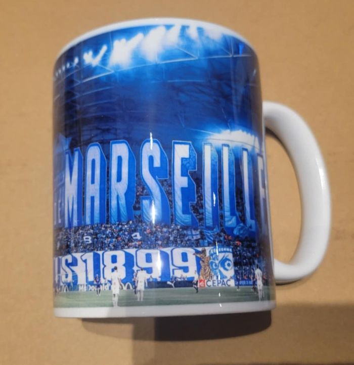 mug banderole olympique de marseille OM. mug sublimation passe au lave-vaiselle et micro-onde envoi rapide et soignée dans boite blanche