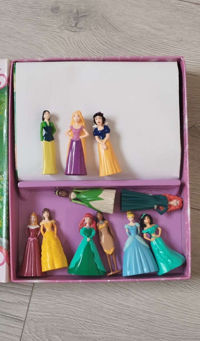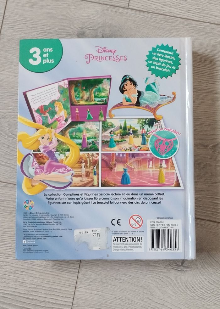 Bonjour, Je vends ce livre comptines et figurines les princesses de Disney en bon état, le rangement des figurines et du tapis est abîmé voir photo et manque le bracelet