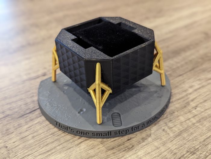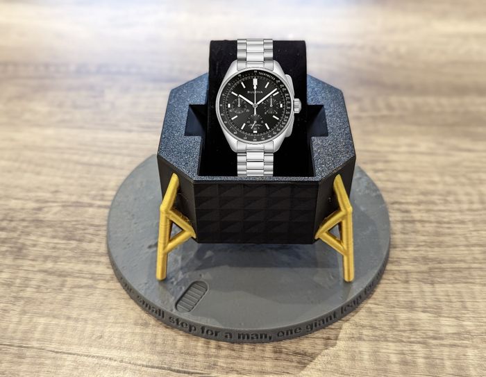Présentoir de montre sur le thème des missions Apollo. Idéal pour sublimer vos montres Speedmaster, MoonSwatch et Lunar Pilot. Le présentoir est réalisé via un processus d'impression 3D. La vente comprend le module lunaire, le coussin de présentation et le sol lunaire. 🚨Les montres ne seront pas vendues avec le présentoir.🚨