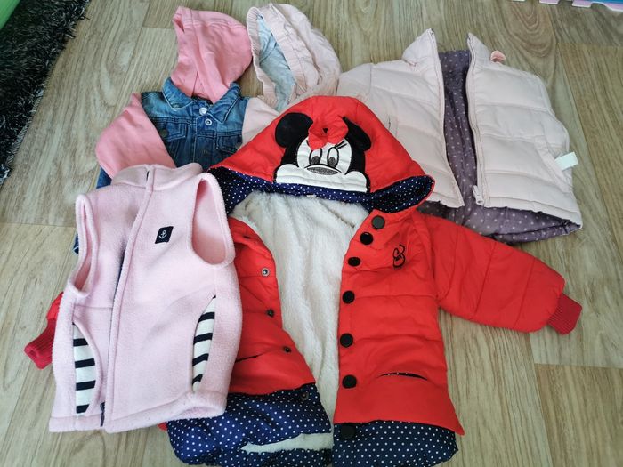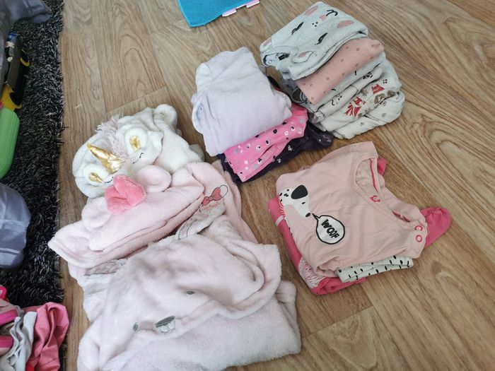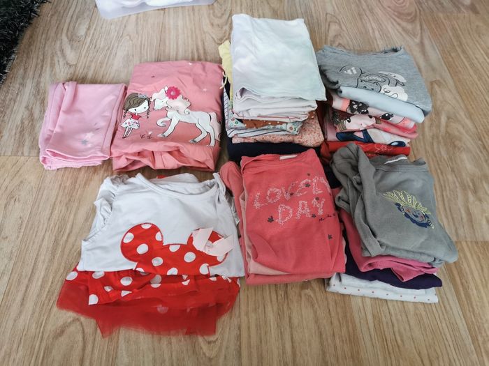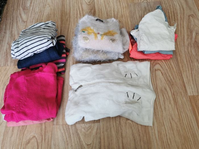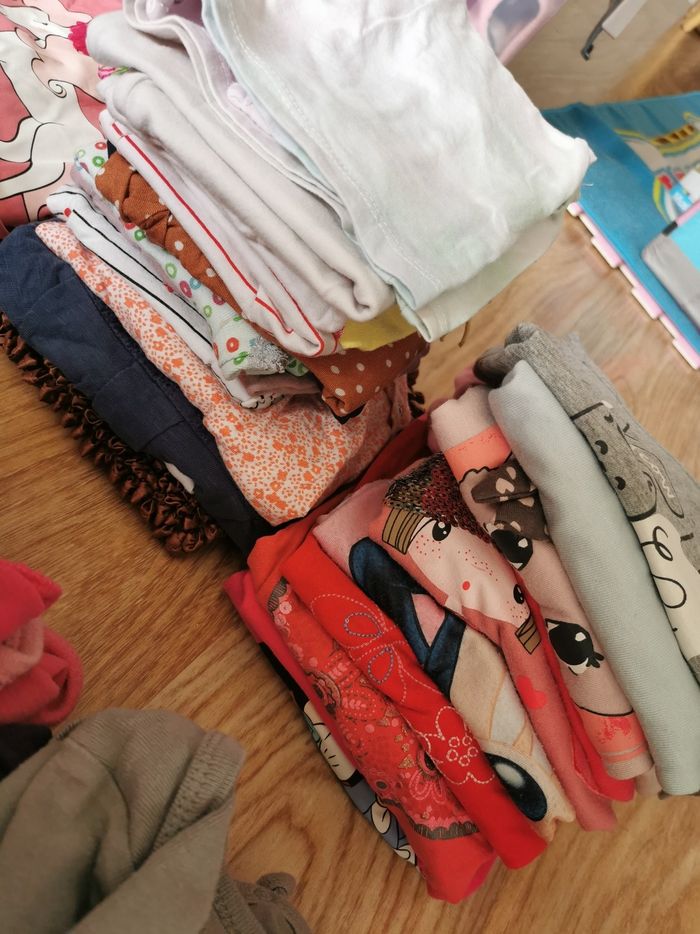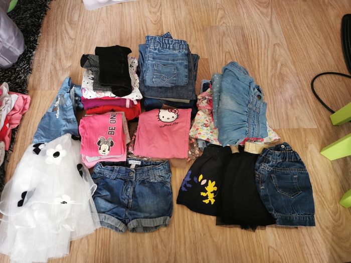 POSSIBILITÉ DE FAIRE DES LOTS AVEC REDUC EN + DANS LA LIMITE DU RAISONNABLE 😁 Vend gros lots vêtements filles 18/24 mois ( 90 % de 24 Mois) en très bon état, maison non fumeur. ( 95 pièces) soit 1/2 euros l'article 15 t-shirts manches courtes 10 t-shirts manches longues 5 bodys courts, 5 body longs 2 ensemble t-shirt court / jupe + robe manche courte / pantalon, 1 paire de baskets 1 paire de chaussons T 24, 6 leggins, 4 pantalons jogging pyjamas 2 leggings, 5 jeans,7 robes,2 jupes,1 short, 1 jupe legging, 2 peignoirs, 1 combinaison polaire, 5 pyjamas hiver + 3 ensembles hiver 3 pyjamas été dont un ensemble 7 gilets, 2 pulls, 2 chemises, 1 veste, 4 manteaux dont une doudoune, réversible, une parka, une veste jean manche coton, 1 veste, 1 gilet polaire sans manche