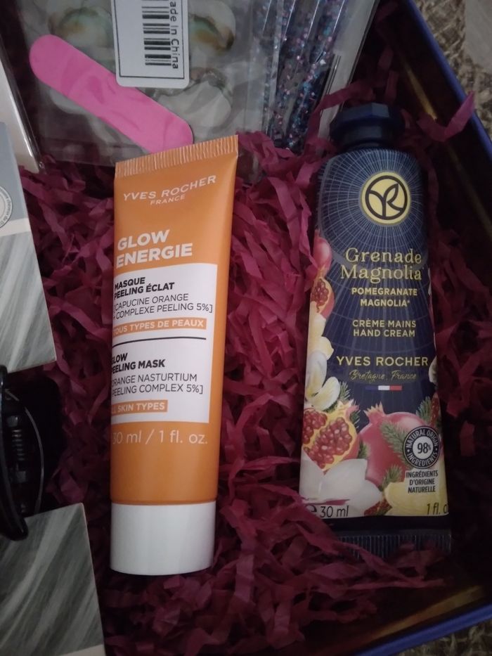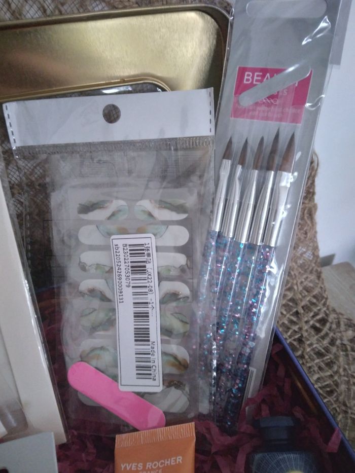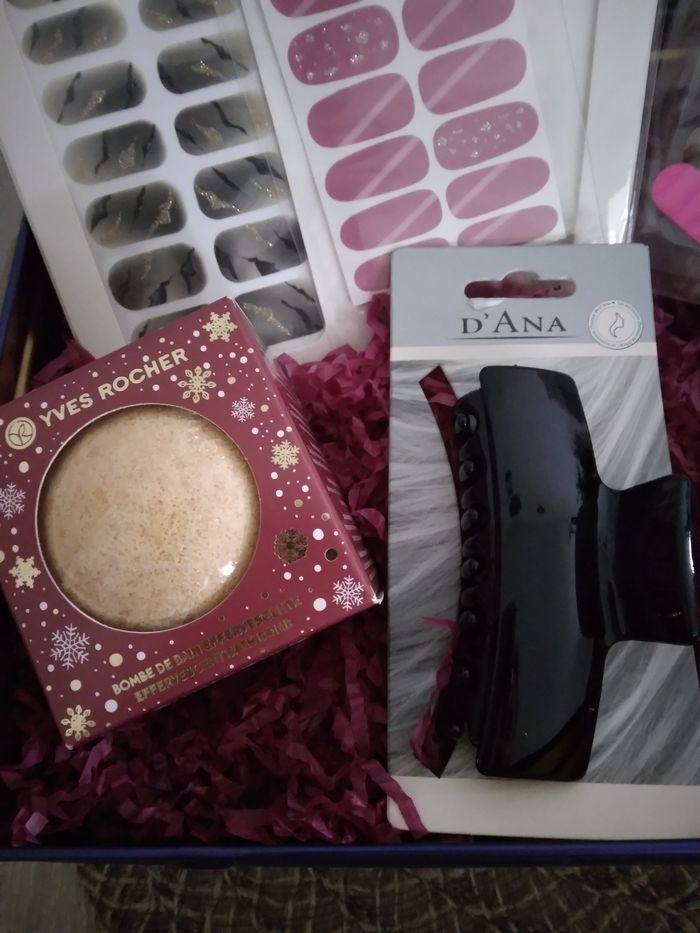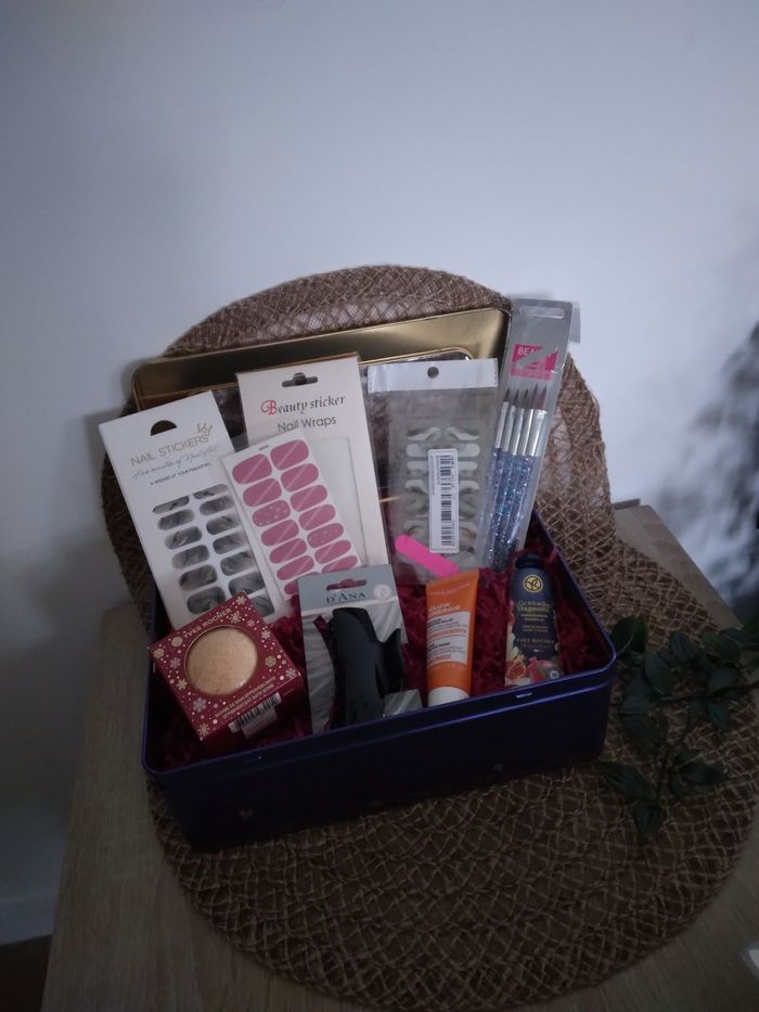 Coffret beauté et bien être neuf Le Coffret comprend : 🌸4 planches de stickers pour les ongles neuf 🌸Lot de 5 pinceaux nails arts neuf 🌸Bombe de bain Yves Rocher neuf 🌸Crème main Grenade magnolia Yves Rocher neuf 🌸Pince a cheveux neux 🌸Masque visage Yves Rocher neuf 🌸Coffret en métal bleu et doré Chaque articles possède sa propre annonce.