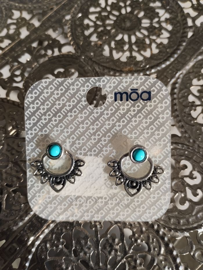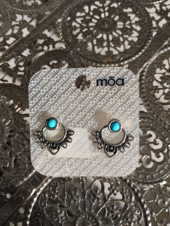 Je vends ces boucles d'oreilles Lotus en acier avec des pierres turquoises en 2 parties pour un rendu original. - Type de produit : Boucles d'oreilles - Univers : Femme - Marque : Moa - Matière : Acier - Pierres : Turquoises État neuf. N'hésitez pas à me contacter pour plus d'informations !
