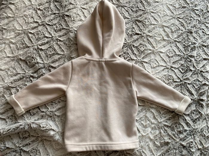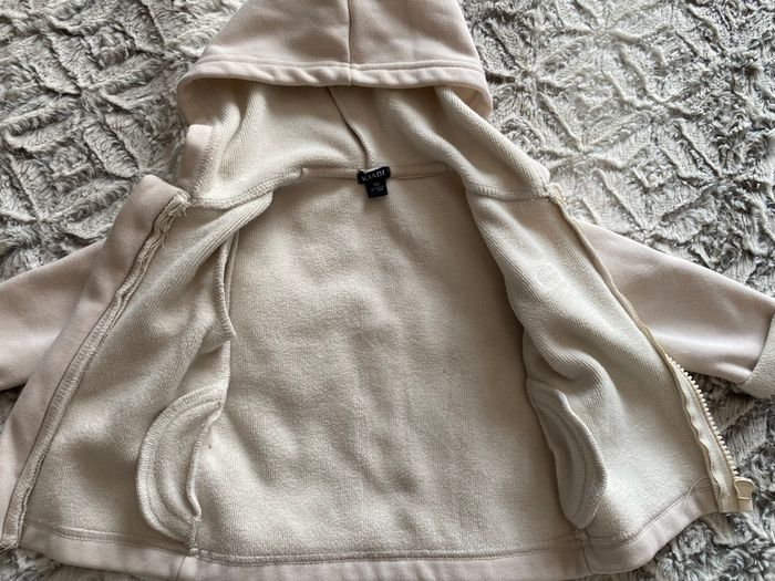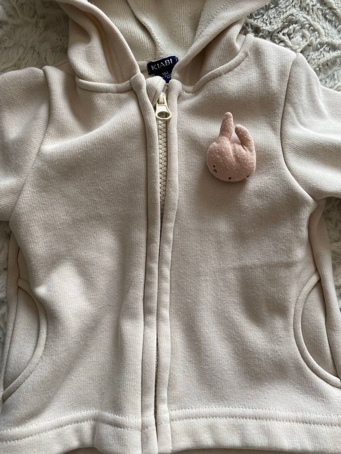 Jolie veste à capuche rose pale, fermeture éclaire, 2 petits poches avec petite tête de lapin sur poitrine. 100% coton. Très bon état . Jolie petite veste pour la chasse aux œufs😉 9 mois. kiabi