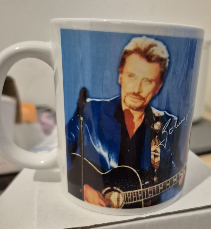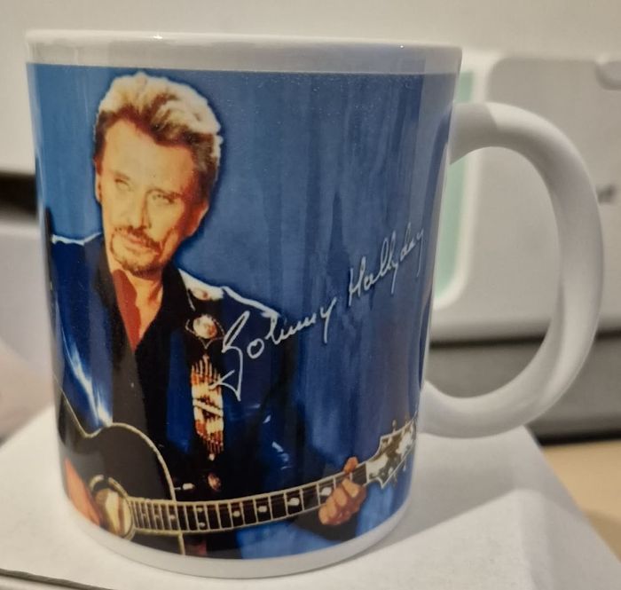 mug johnny tenant une guitare noir sur fond bleu avec signature envoi rapide