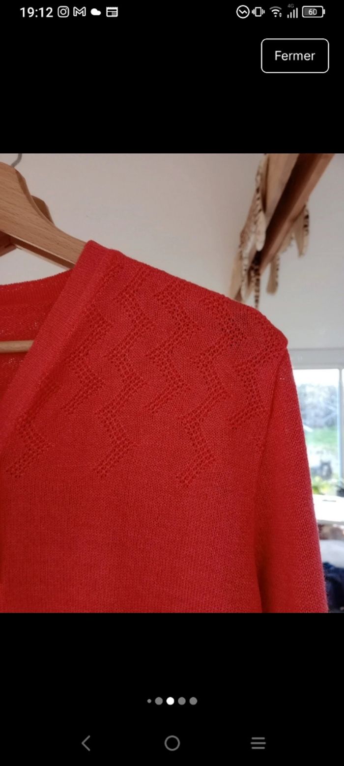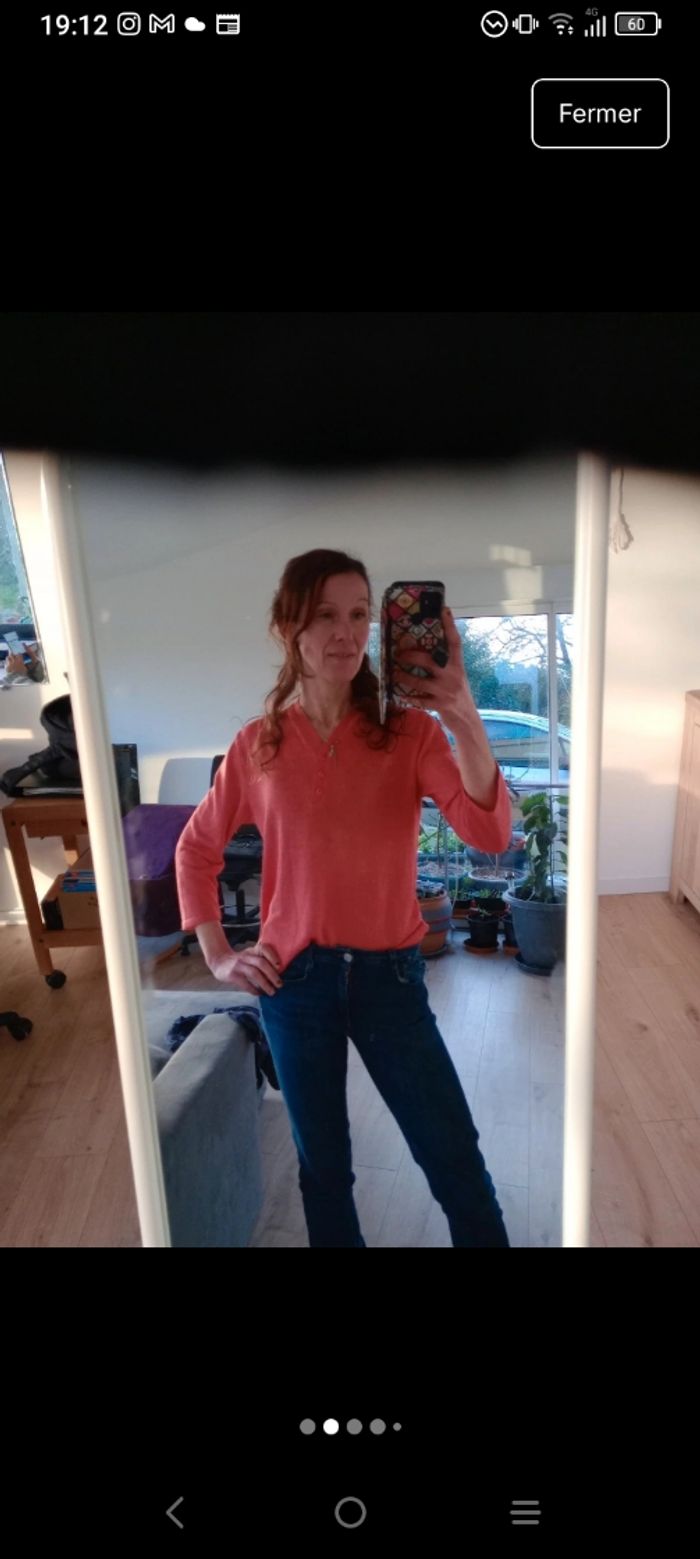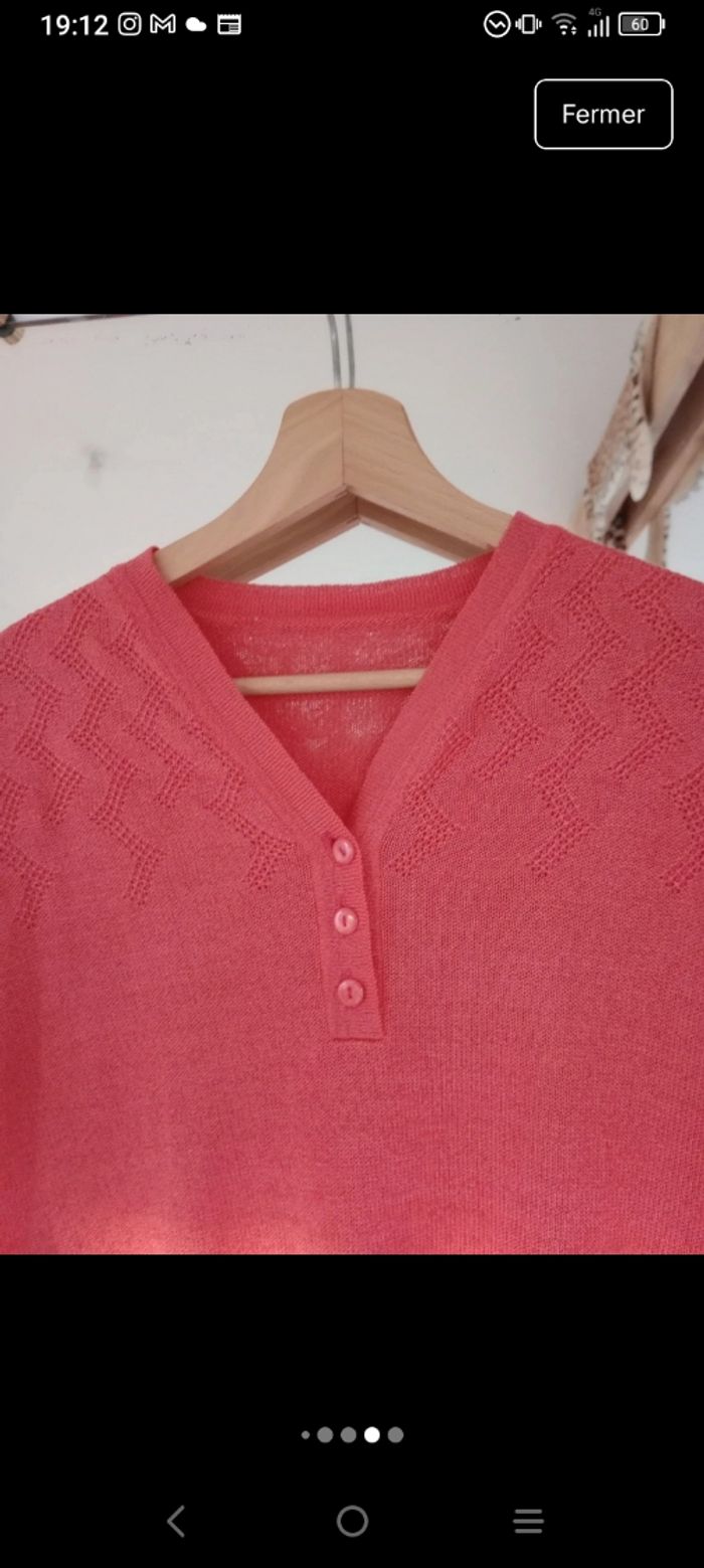 ​ ​Joli haut en maille légère de couleur rose, idéal pour la mi-saison. ​Détails : Encolure boutonnée (style henley) avec trois petits boutons assortis. ​Motifs : Travail de maille ajourée formant des chevrons délicats sur le haut du buste et les épaules. ​Coupe : Manches 3/4 et coupe droite confortable. ​Matière : 87% Acrylique, 13% Nylon (matière douce et souple). ​État : Très bon état. ​Conseils d'entretien : Lavable en machine à 30°C. ​Une pièce lumineuse qui se marie parfaitement avec un jean brut. Longueur 60 cm épaule 43 cm ​#HautFemme #MailleFine #rose #StyleClassique #MiSaison #VêtementFemme #HautAjouré #calomomi_femme42