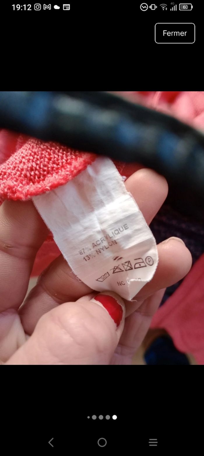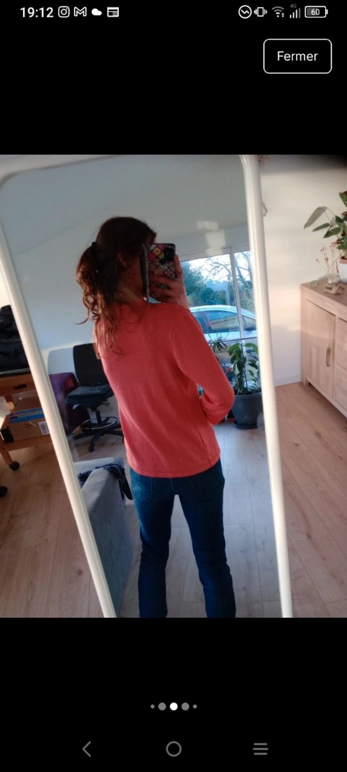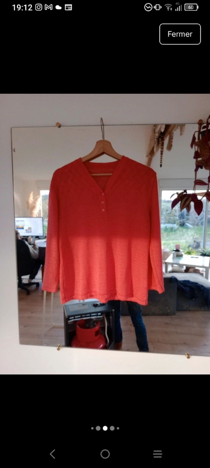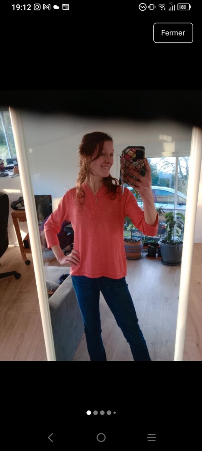 ​ ​Joli haut en maille légère de couleur rose, idéal pour la mi-saison. ​Détails : Encolure boutonnée (style henley) avec trois petits boutons assortis. ​Motifs : Travail de maille ajourée formant des chevrons délicats sur le haut du buste et les épaules. ​Coupe : Manches 3/4 et coupe droite confortable. ​Matière : 87% Acrylique, 13% Nylon (matière douce et souple). ​État : Très bon état. ​Conseils d'entretien : Lavable en machine à 30°C. ​Une pièce lumineuse qui se marie parfaitement avec un jean brut. Longueur 60 cm épaule 43 cm ​#HautFemme #MailleFine #rose #StyleClassique #MiSaison #VêtementFemme #HautAjouré #calomomi_femme42