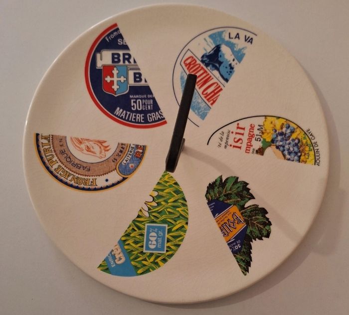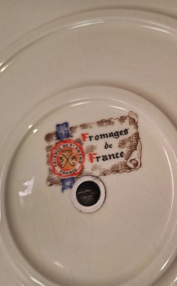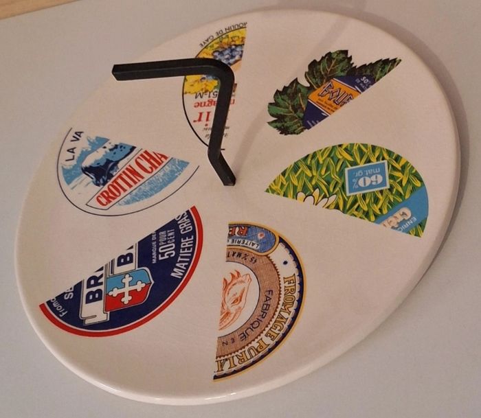 Décoré de moitiés de boîtes de fromages. Manche en fer forgé qui se visse. Faïence de St-Amand. Deux petits éclats sur le bord qui se voient peu. Diamètre 34 cm.