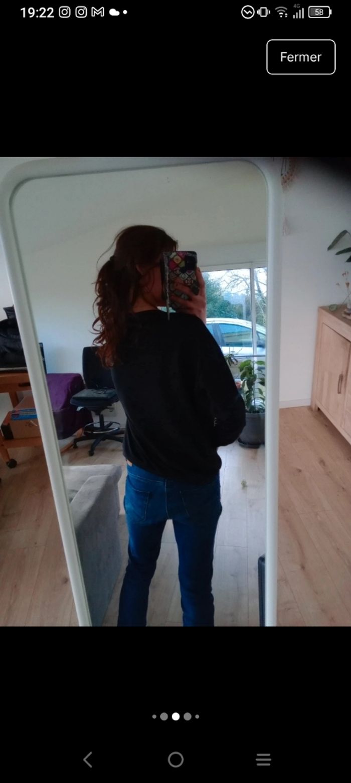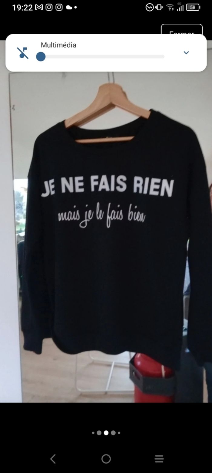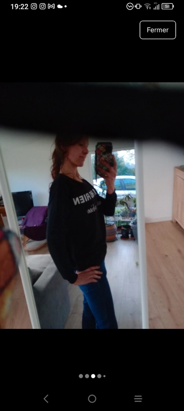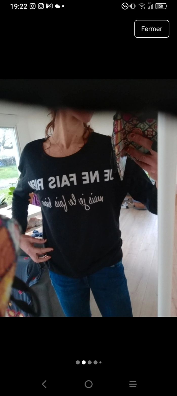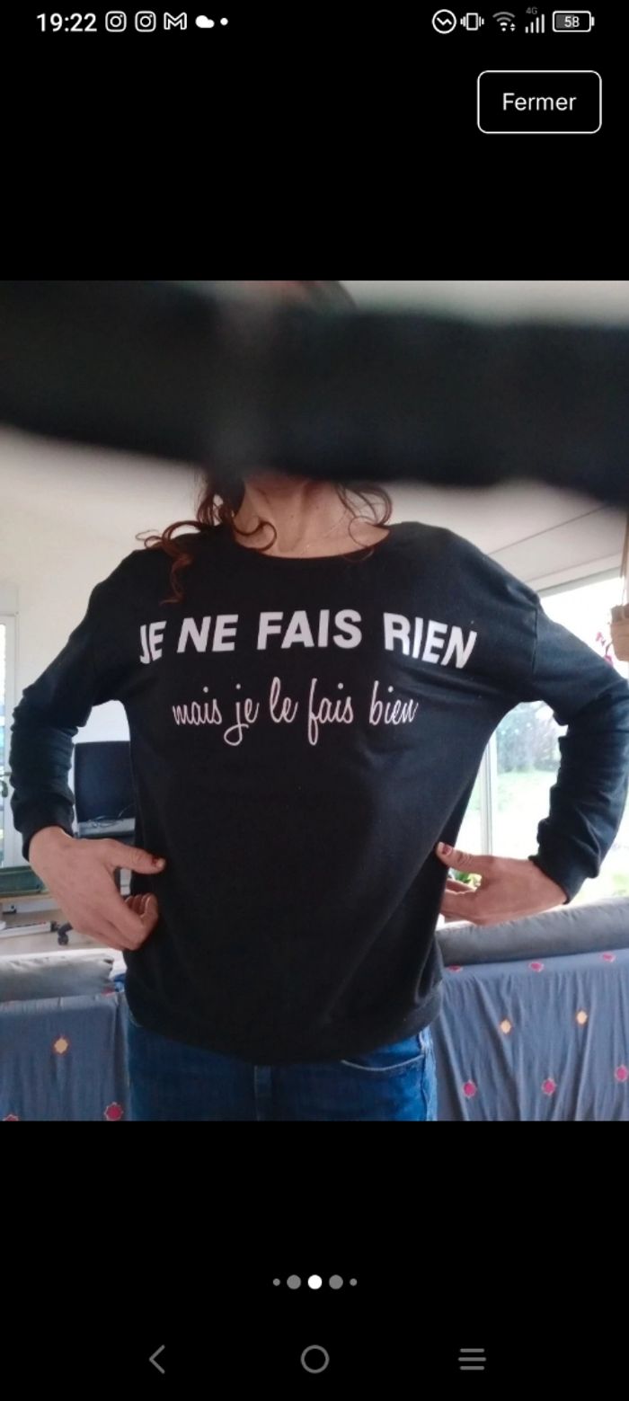 Sweat-shirt noir de la marque Mim, confortable et original avec son message humoristique. ​Message : "JE NE FAIS RIEN mais je le fais bien" imprimé en blanc sur l'avant (la partie je ne fais rien est épaisse... Trois lettres légèrement craquelées voir les deux dernières photos ​Coupe : Coupe classique à manches longues et col rond. ​Couleur : Noir profond avec lettrage contrasté. ​Un basique fun et facile à porter au quotidien avec un jean. Plus d'étiquette taille ni matière je pense à du coton Longueur 60 cm #calomomi_femme40 ​#SweatFemme #Mim #SweatAMessage #ModeHumour #VetementNoir #StyleDecontracte #SweatShirt #TailleL