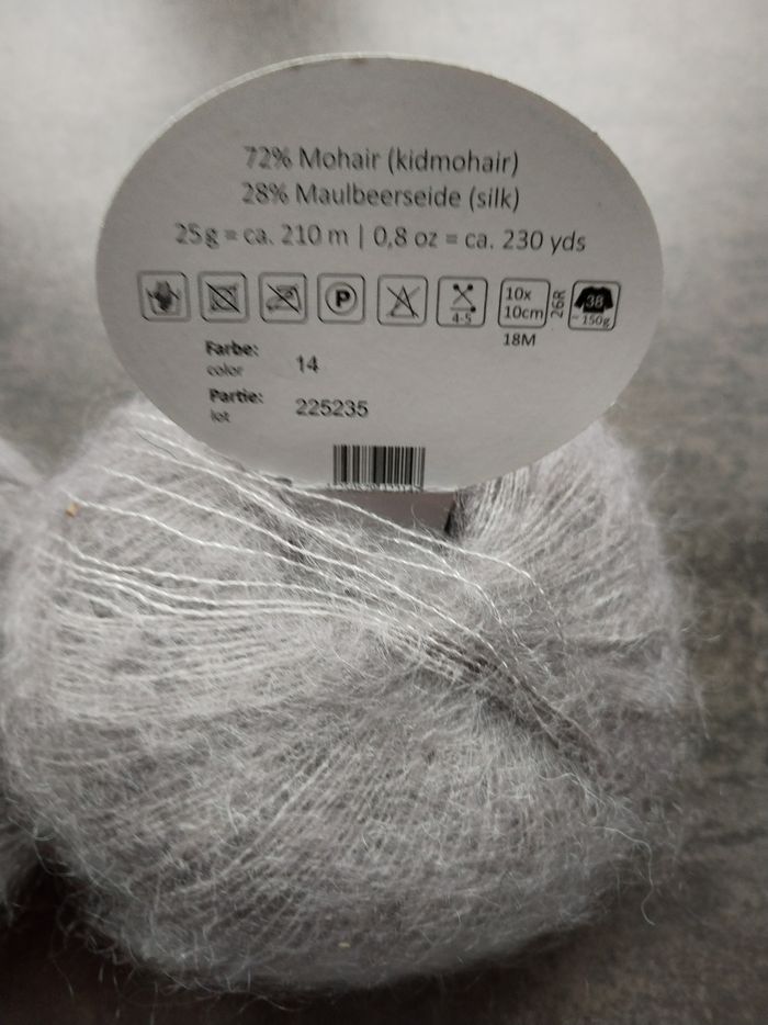 Lot de 2 pelotes de laine luxueuse 🧶 ​Il s'agit de la gamme "Kid-Mohair mit Seide" (Kid-Mohair avec Soie) un mélange d'une extrême douceur, idéal pour tricoter des châles aériens, Écharpe au point de bourse ou à utiliser en fil d'accompagnement Détails techniques par pelote : ​Composition : 72% Kid Mohair, 28% Soie (Maulbeerseide) aspect très vaporeux ​Poids : 25g ​Longueur : environ 210 mètres ​Aiguilles recommandées : 4 - 5 mm ​Couleur : Gris perle / Gris clair (très lumineux) ​État : Neuf, jamais utilisé (avec bande d'origine) Prix d'origine : Environ 11-12 € l'unité en boutique spécialisée ​Envoi rapide et soigné 📦 N'hésitez pas si vous avez des questions ! Profitez des autres annonces pour regrouper les achats et économiser sur les frais de port 👍