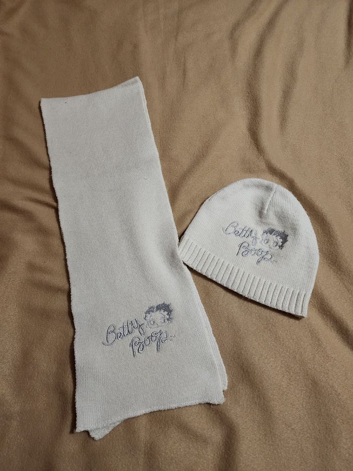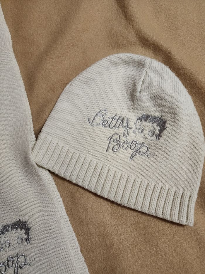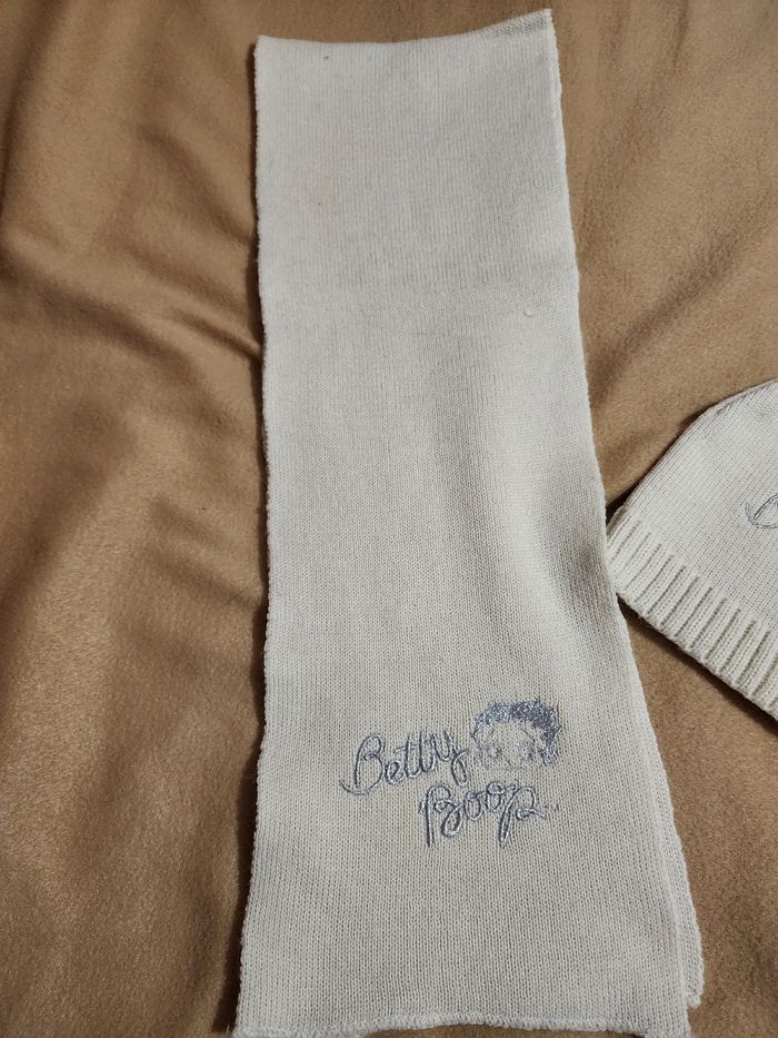 Ensemble bonnet et écharpe "Betty boop" Il y a des minis bouloches sur le bonnet Marque : Betty Boop Taille unique mais qui correspond à du 8 ans Très bon état