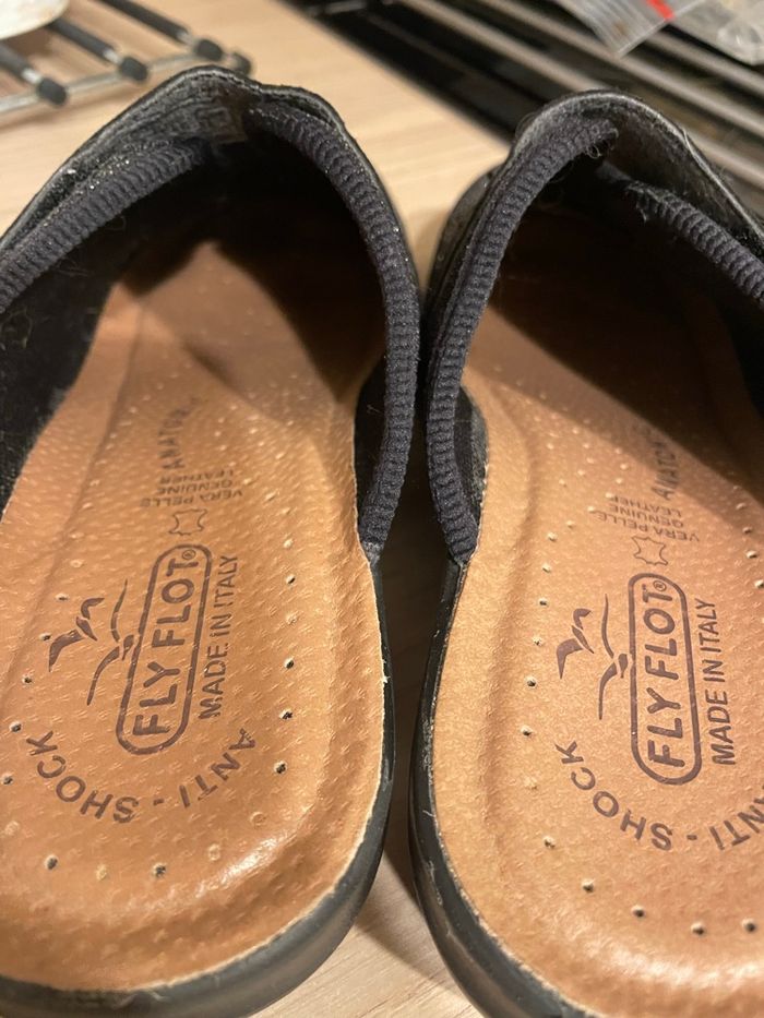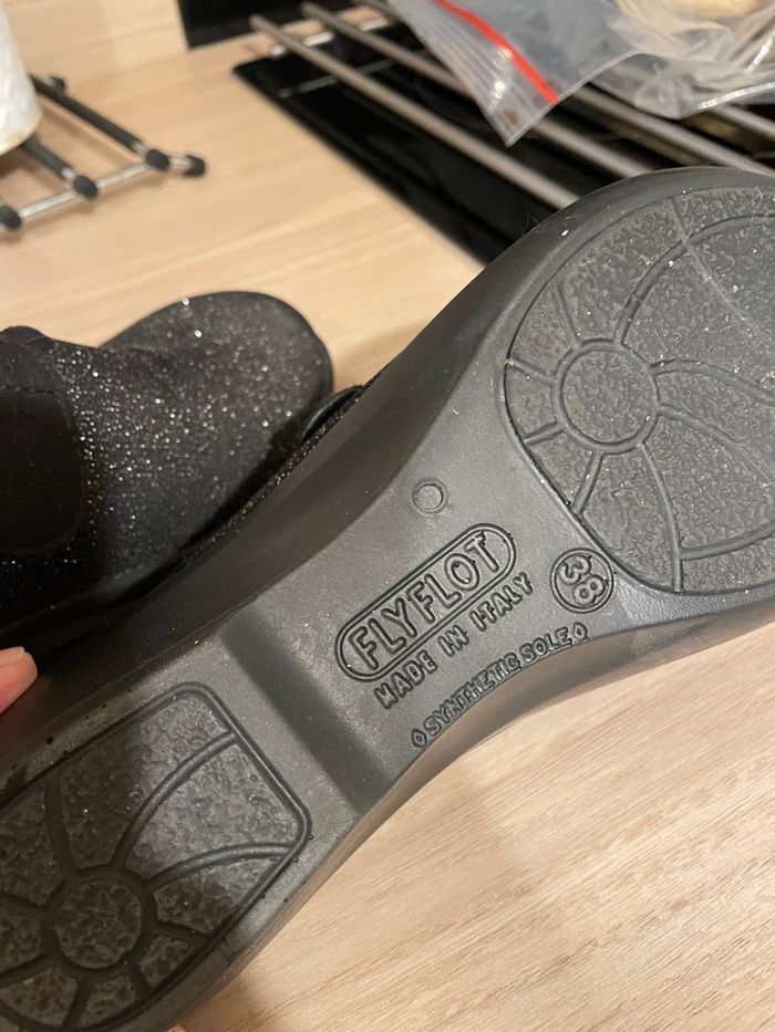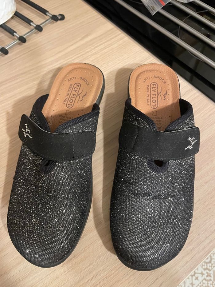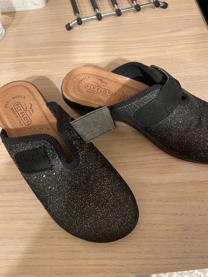 Chaussures d intérieur femme pointure 38 Très peu portée. En très bon état . Interieur cuir . Chaussures de conforts Marque fly flot . Noir pailletée