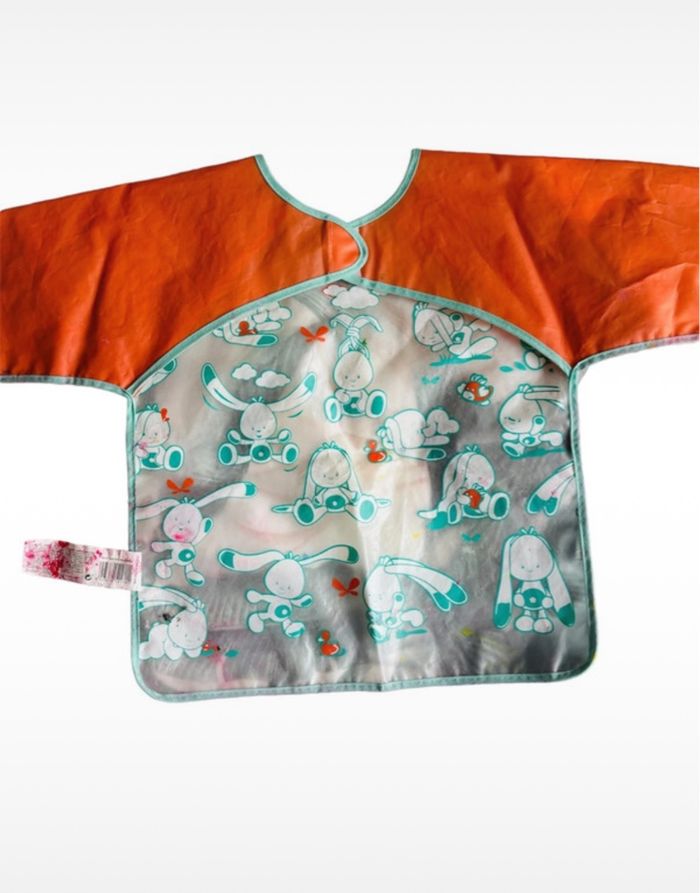 Blouse en plastique pour protéger bébé de la peinture a servi donc il y a des taches de peinture mais pas de trou Peut encore servir Pas de taille noté #eaguilillagarcondouzemois
