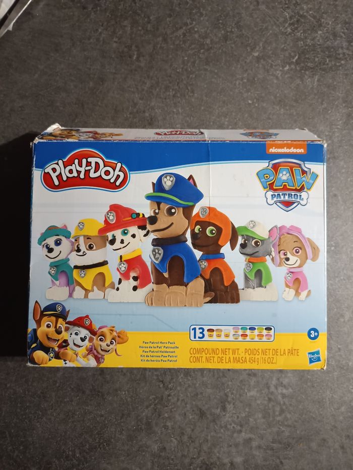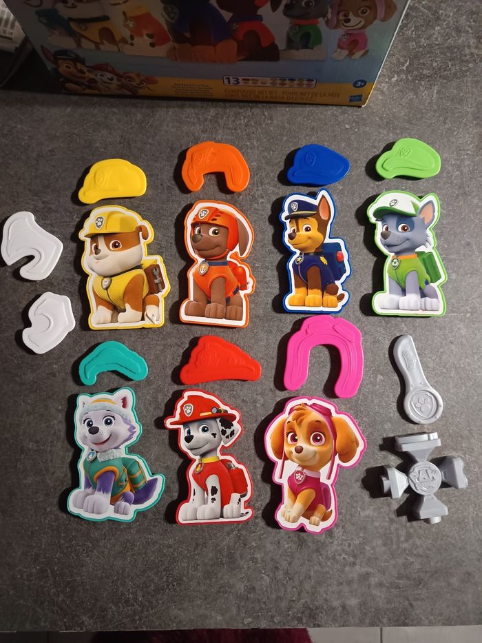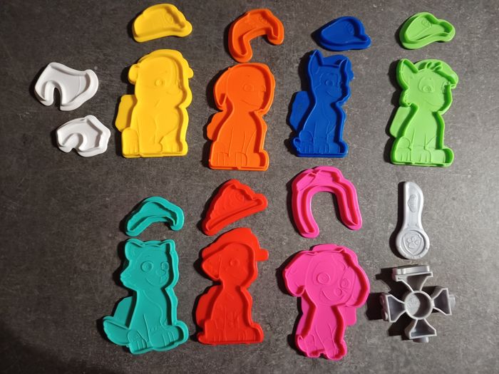 Boite avec 18 Moules pour pâte à modeler Pat patrouille, Très bon état Manque le rouleau et la tour. ⚠️ VENDU SANS PATE À MODELER !