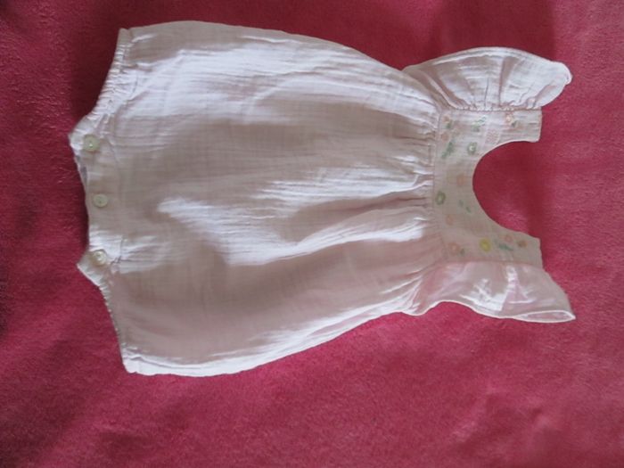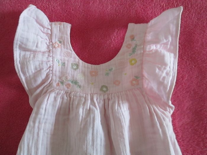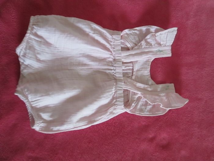 Vends barboteuse Tartine et Chocolat. Petites broderies en haut sur le devant. Volants autour des emmanchures. Bretelles réglables. 100 % coton. Taille 6 mois. Neuve, jamais portée. Pour plus de choix, allez consulter mes autres annonces.