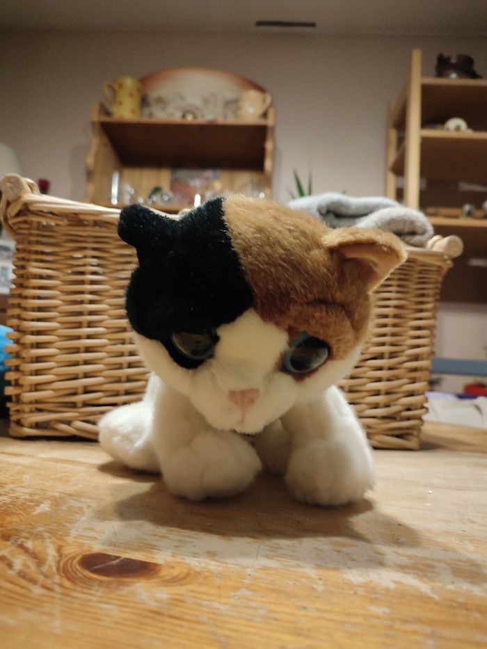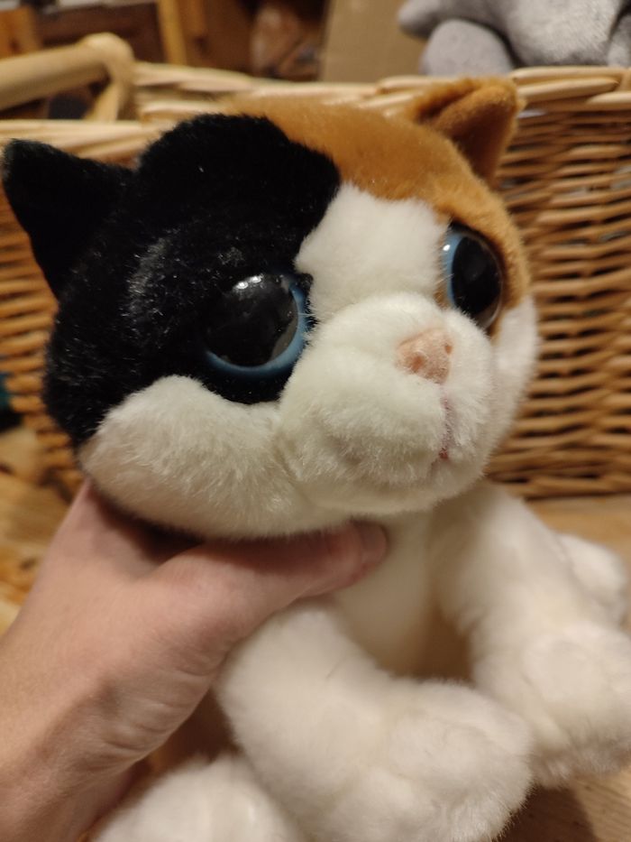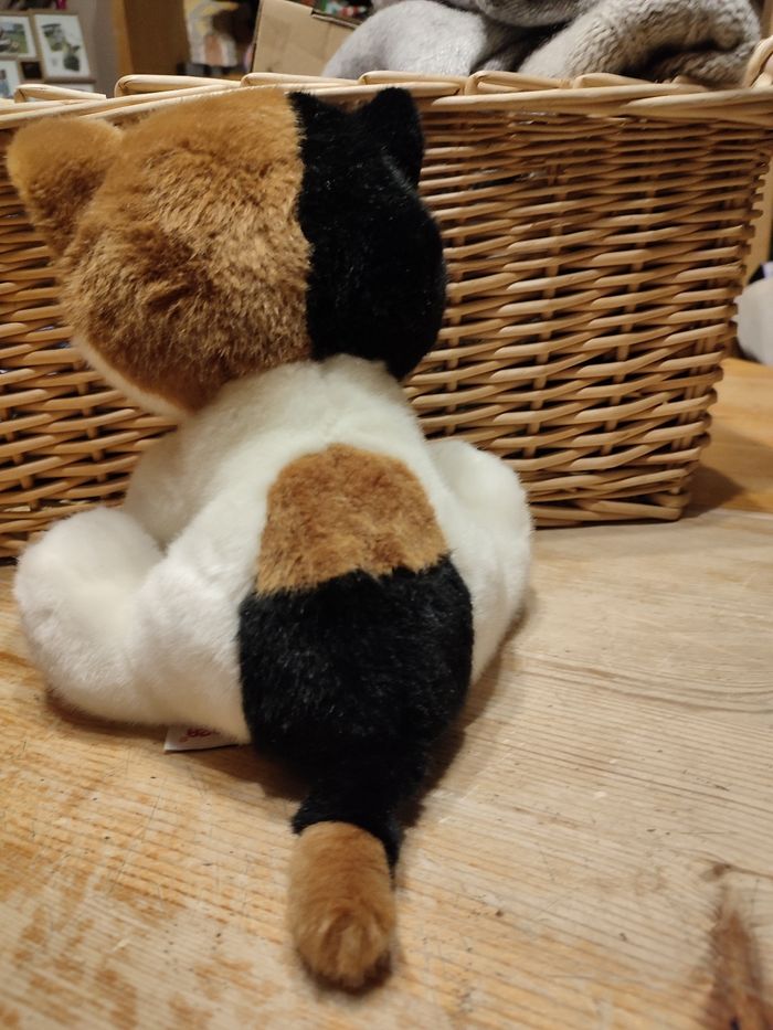Peluche chat type gouttière 3 couleurs (noir, marron, blanc) aux yeux bleus Environ 20 cm de hauteur Marque Aurora Polyester Idéal pour bebes et collection