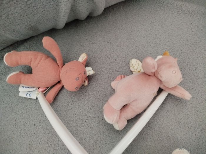 Vends mobile musical bébé, de marque noukies. 4 animaux : hippopotame, rhinocéros, lapin et licorne.